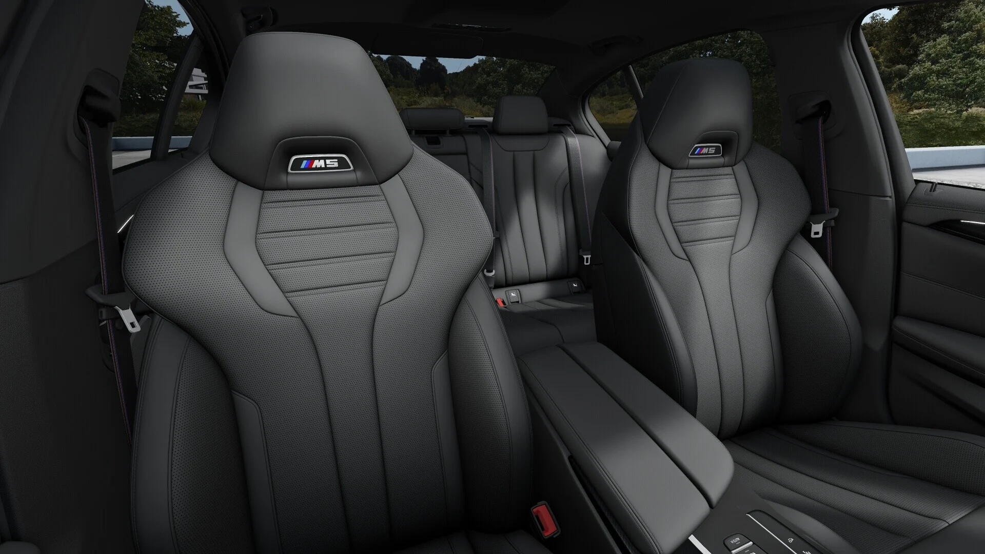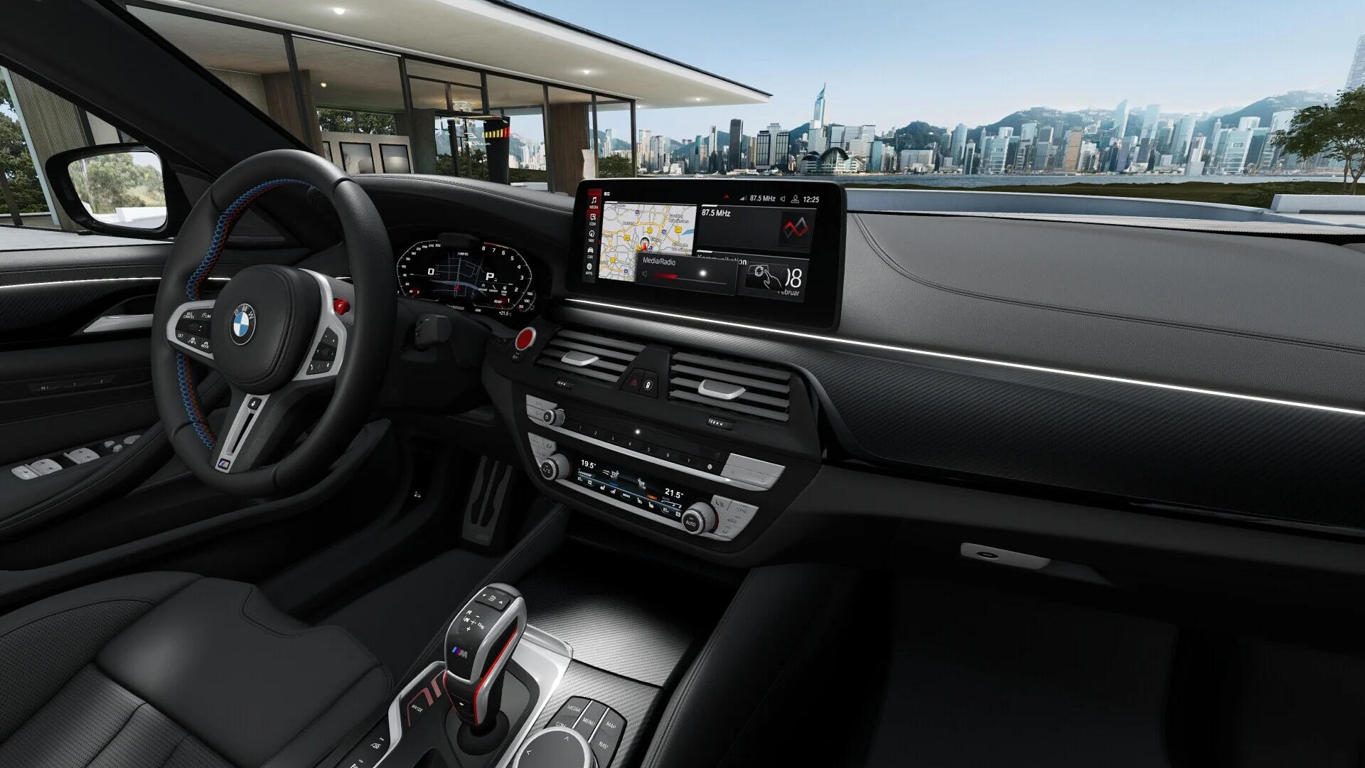 Wnętrze M5 jest eleganckie i pełne najnowszych technologii. Kabina została starannie zaprojektowana, aby zapewnić kierowcy i pasażerom maksymalny komfort i luksus. Wykorzystano wysokiej jakości materiały, takie jak skóra, aluminium i włókno węglowe, aby stworzyć ekskluzywną atmosferę. Fotele sportowe z doskonałym podparciem bocznym zapewniają idealne trzymanie ciała podczas dynamicznej jazdy. Kokpit jest nowoczesny i intuicyjny, z dużym ekranem dotykowym i systemem multimedialnym, umożliwiającym łatwą obsługę różnych funkcji samochodu.