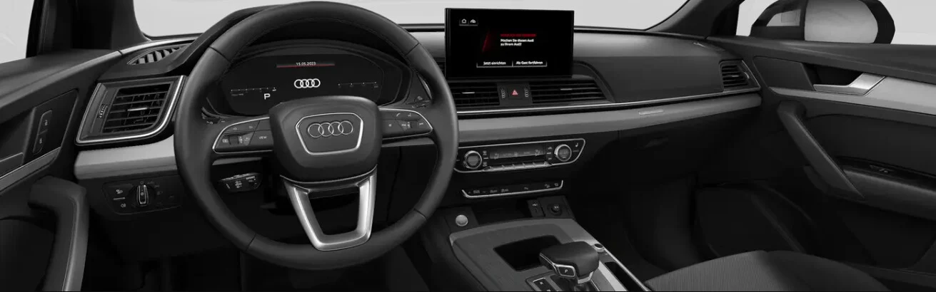 Wnętrze Audi Q5 S line zapewnia luksusową i komfortową przestrzeń. Ergonomicznie zaprojektowane fotele, wykończenia najwyższej jakości materiałami premium i dopracowane szczegóły tworzą atmosferę elegancji i wygody. Technologia jest wiodącym elementem wnętrza, z zaawansowanym systemem multimedialnym i intuicyjnym interfejsem, który umożliwia łatwe sterowanie funkcjami pojazdu.