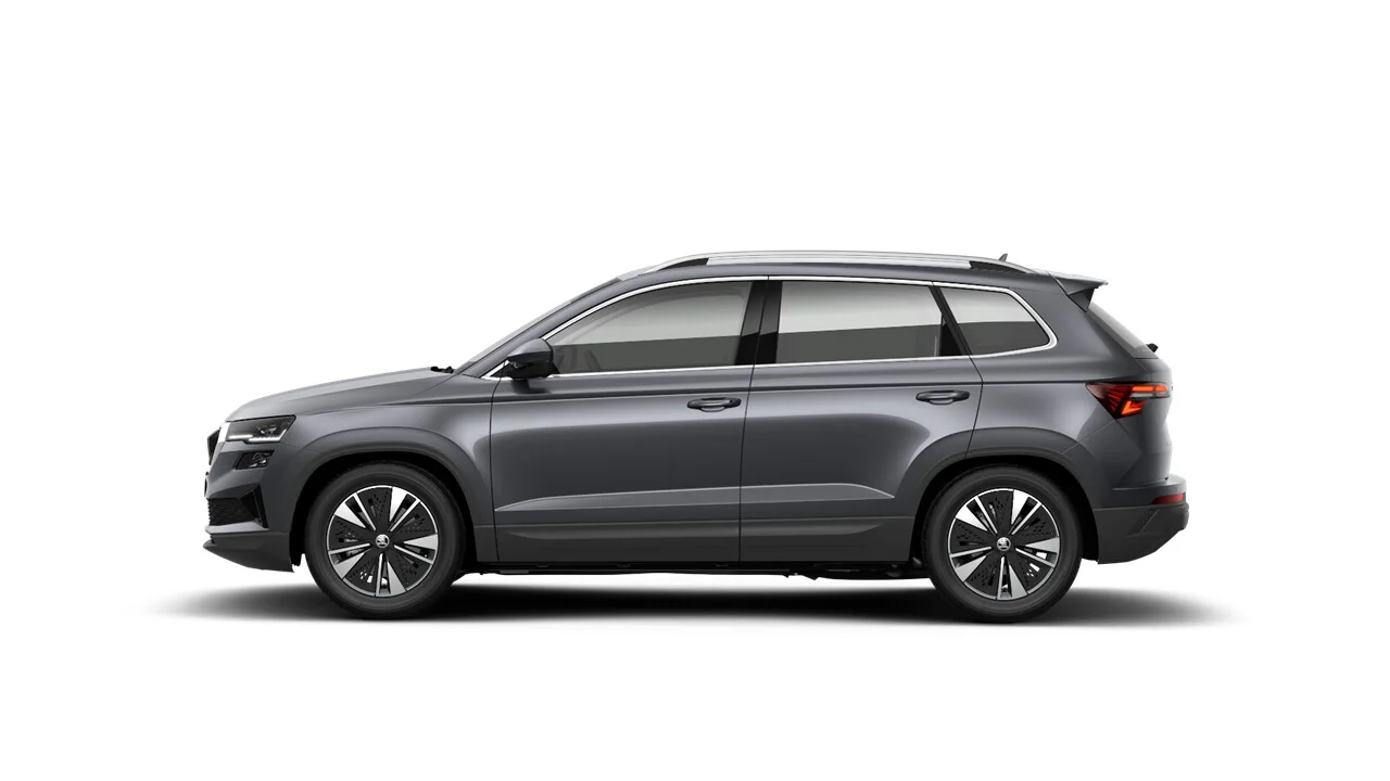 Z zewnątrz Skoda prezentuje się dynamicznie i nowocześnie. Ma charakterystyczną sylwetkę SUV-a, z zaokrąglonymi krawędziami i muskularnymi nadkolami. Przód pojazdu zdobi duża, chromowana atrapa chłodnicy oraz ostre reflektory LED. Tył Karoqa wyróżnia się smukłymi, poziomymi lampami LED i dużym logo marki.