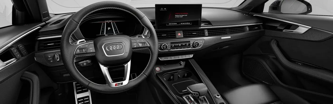 Wnętrze Audi RS4 Avant oferuje wysoką jakość wykończenia i doskonały komfort podróżowania. Wygodne fotele z mocnym trzymaniem bocznym, wysokiej jakości materiały i precyzyjne wykończenie tworzą atmosferę luksusu i sportowej elegancji. Przestronność kabiny i duży bagażnik zapewniają wygodę i praktyczność, niezależnie od celu podróży.