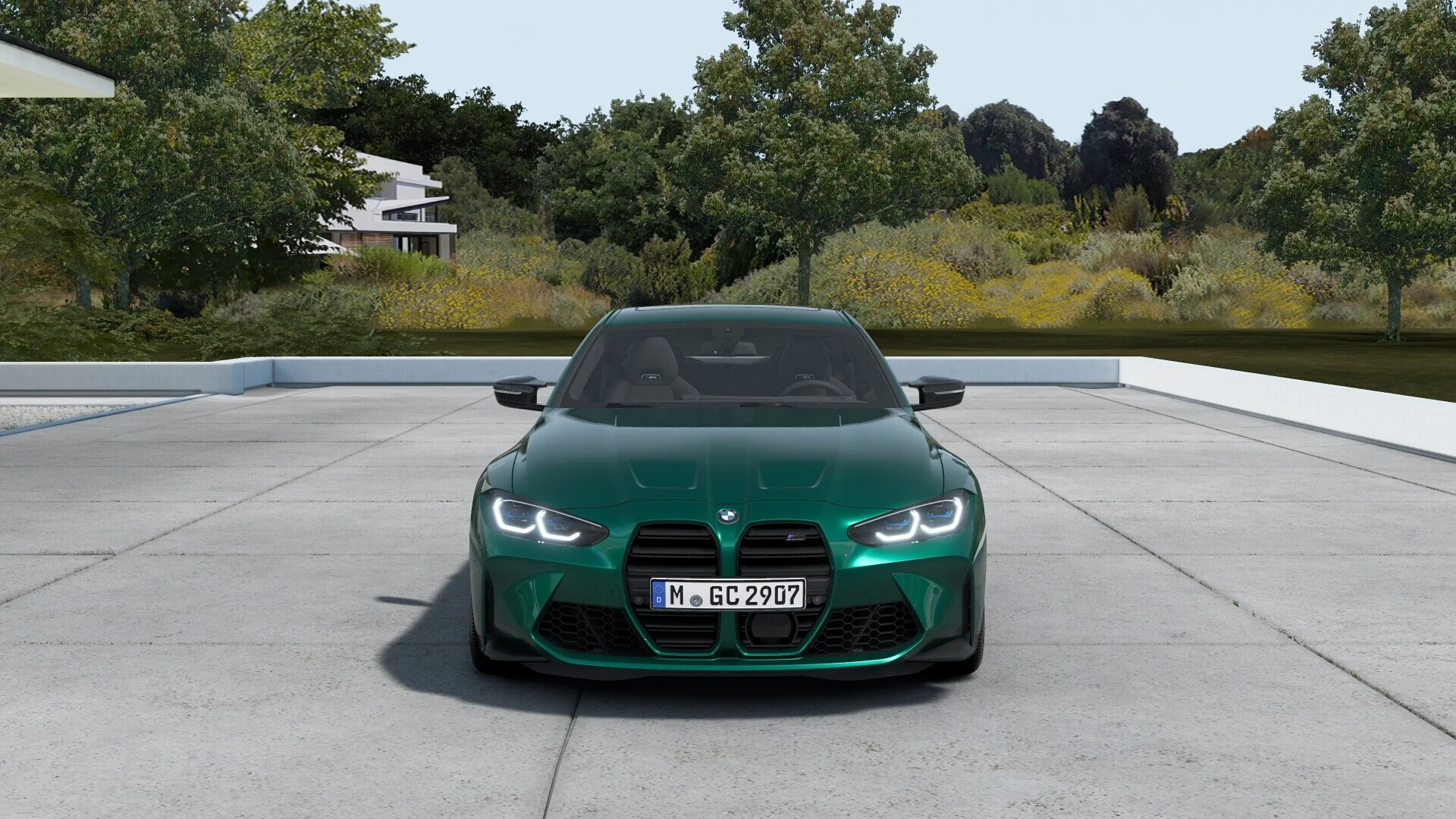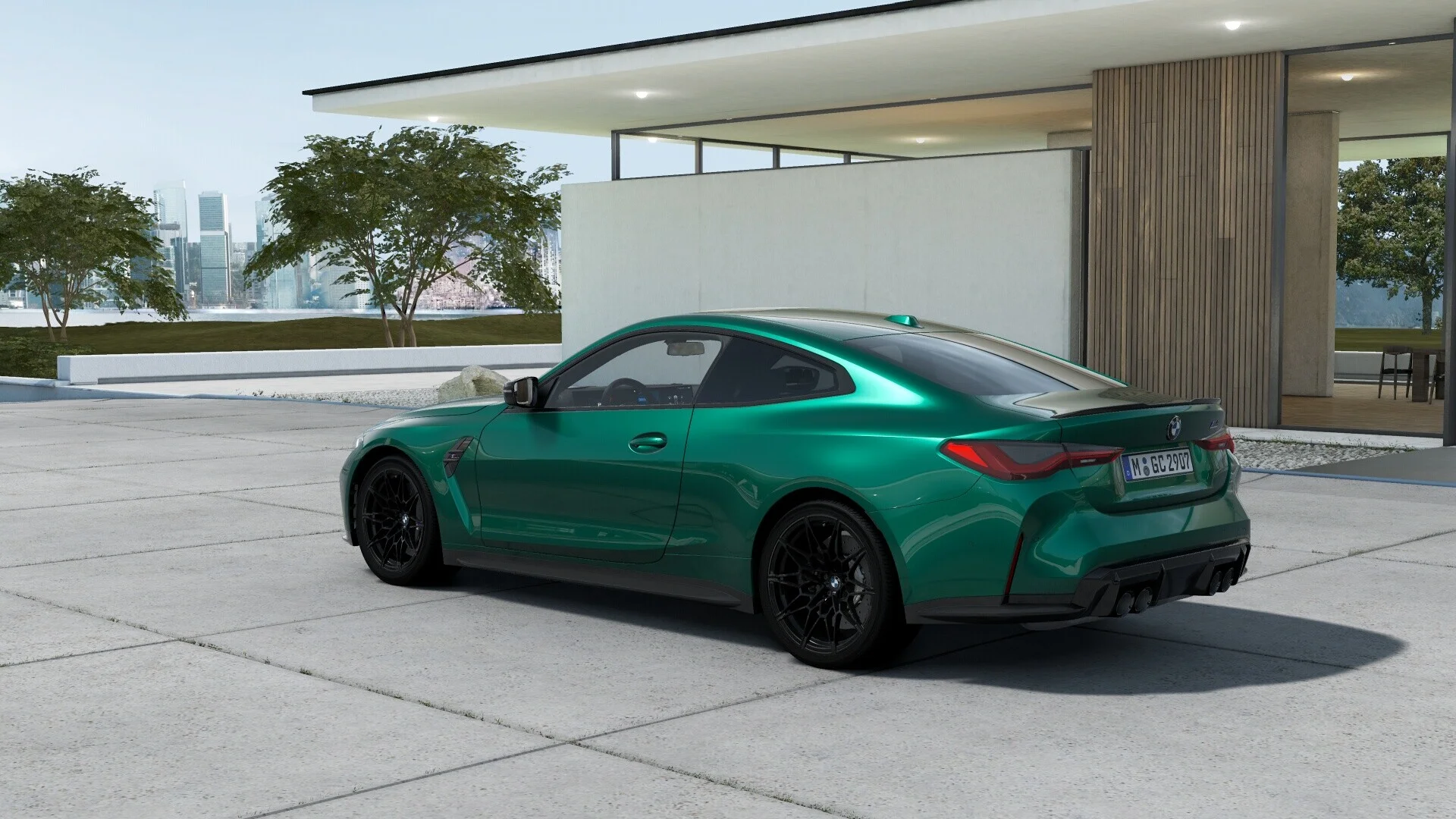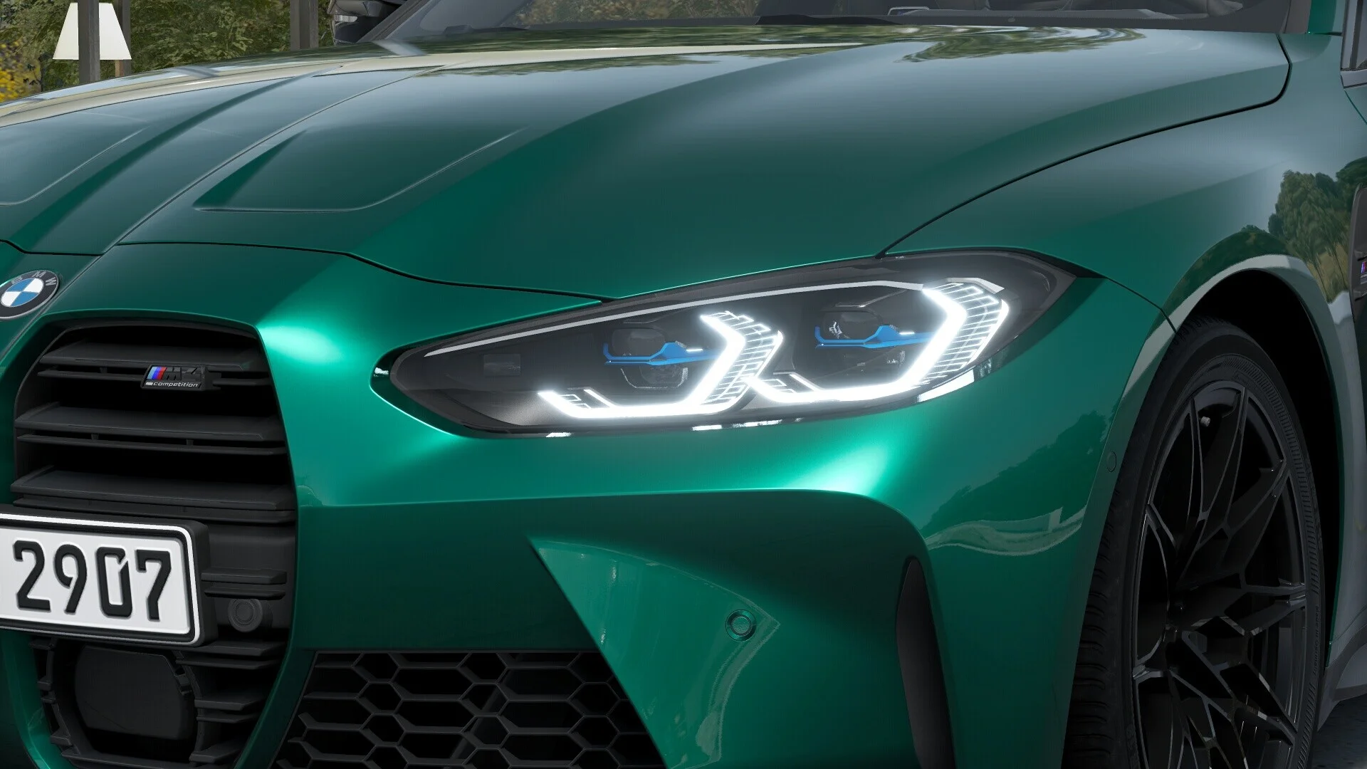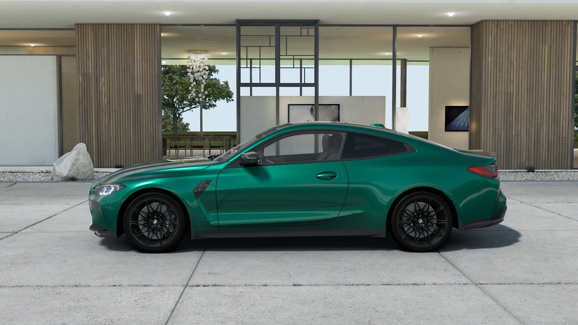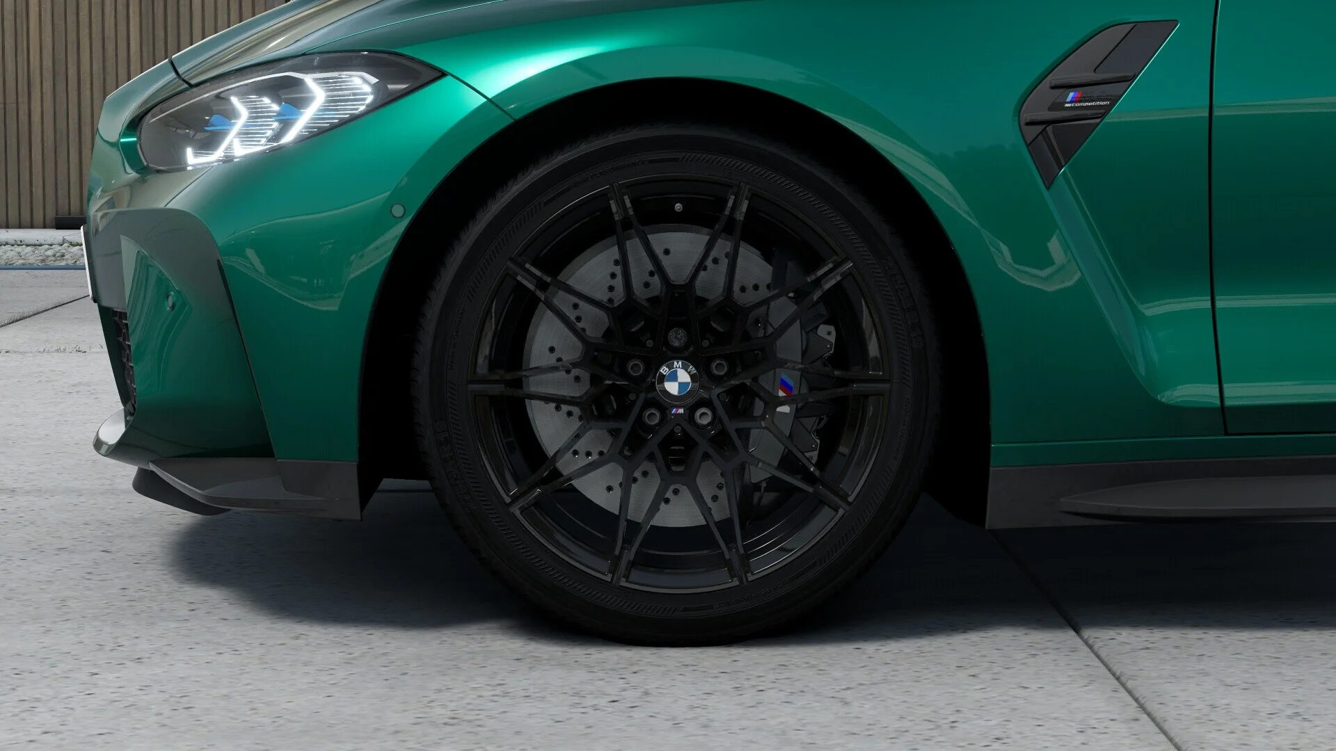 Z zewnątrz BMW M4 Competition prezentuje się bardzo agresywnie i dynamicznie. Charakterystyczna, muskularna sylwetka, nisko osadzona linia dachu, a także nowoczesne detale stylistyczne, takie jak duże wloty powietrza, krzywizny i linie nadwozia, podkreślają jego sportowy charakter. Przód pojazdu zdobią charakterystyczne podwójne nerkowate grille, które są elementem charakterystycznym dla modeli BMW. Dopełnieniem są smukłe reflektory LED, które dodatkowo dodają agresywnego wyrazu.