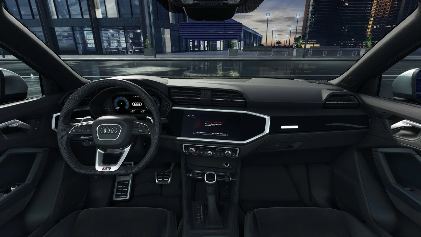 Wnętrze: Kabina Audi RS Q3 to połączenie luksusu i nowoczesnej technologii. Przestronne wnętrze oferuje wyjątkowy komfort, a użyte materiały wykończeniowe są najwyższej jakości. Sportowe fotele zapewniają doskonałe trzymanie boczne, podczas gdy cyfrowe ekrany, w tym panel wskaźników i duży ekran dotykowy na konsoli środkowej, tworzą zaawansowany kokpit.