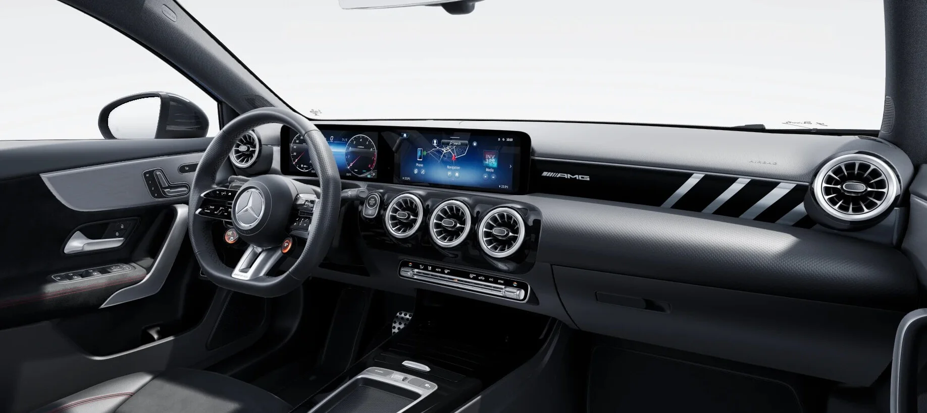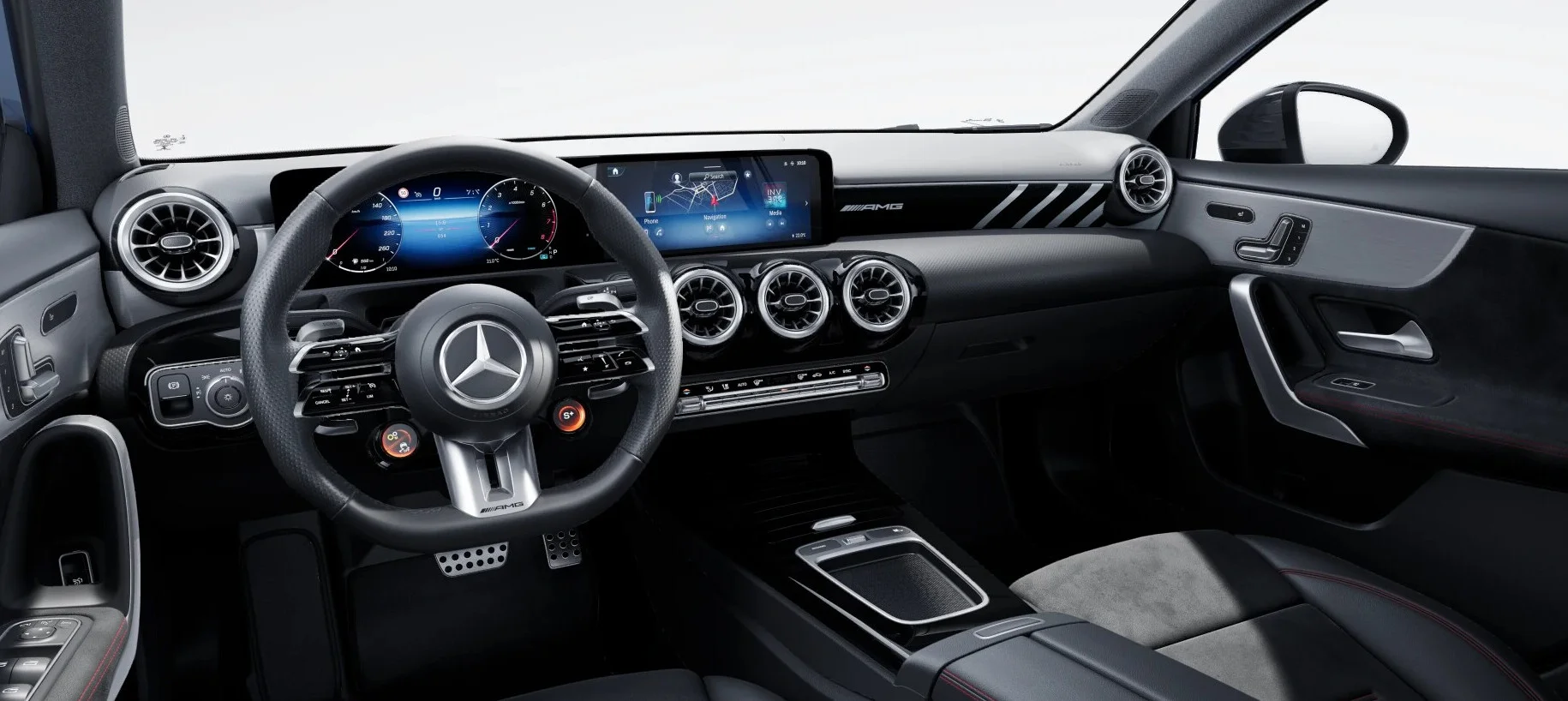 Technologia: Mercedes-AMG A 35 4Matic jest wyposażony w najnowsze systemy bezpieczeństwa i technologię. Wnętrze pojazdu oferuje luksusowe wykończenie i zaawansowane systemy multimedialne, w tym duży ekran dotykowy, który obsługuje system MBUX (Mercedes-Benz User Experience) zapewniający intuicyjne korzystanie z nawigacji, systemów rozrywki i łączności. Ponadto, auto posiada zaawansowane systemy wspomagające kierowcę, takie jak asystent pasa ruchu, adaptacyjny tempomat, czy system automatycznego hamowania.