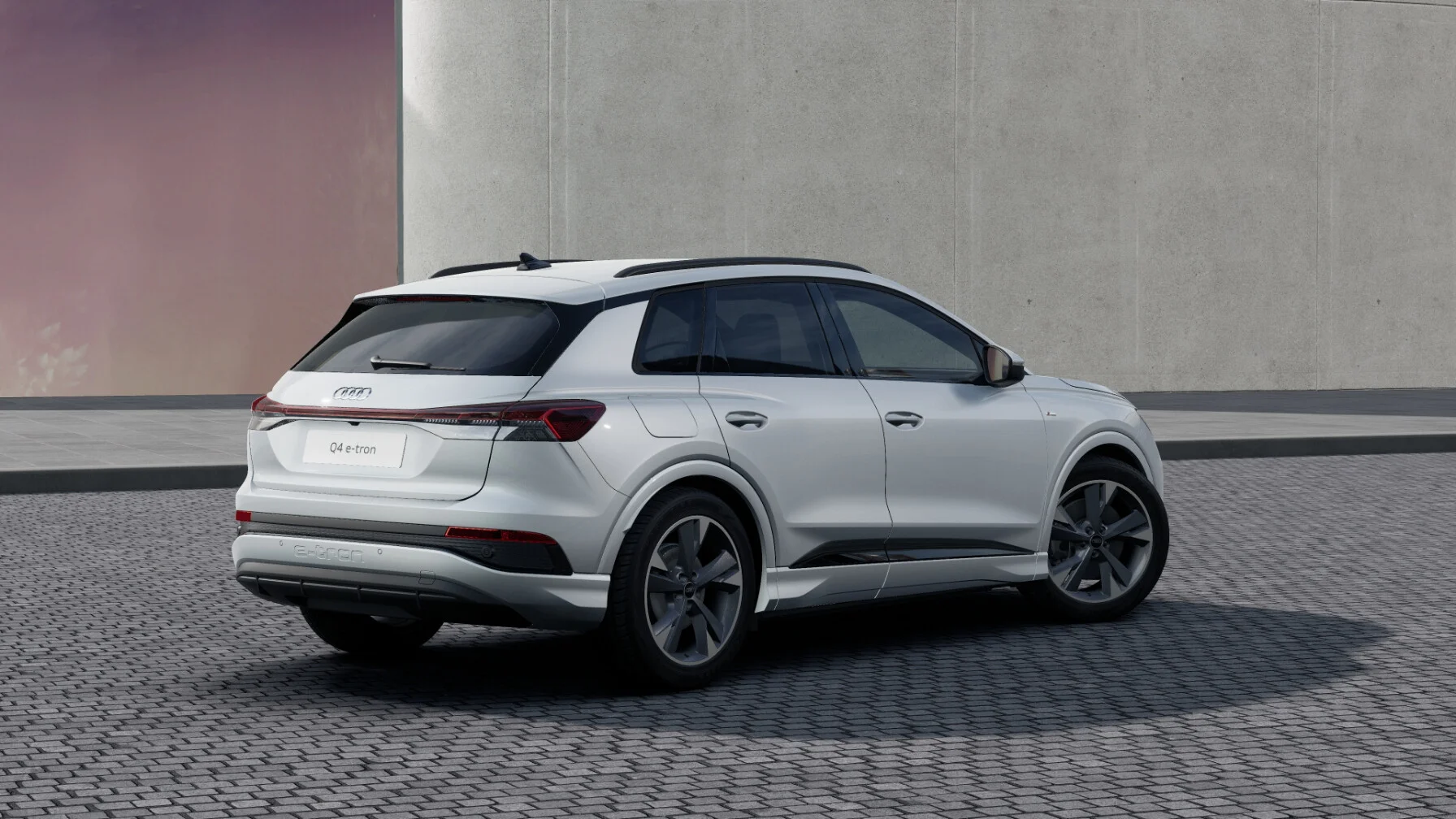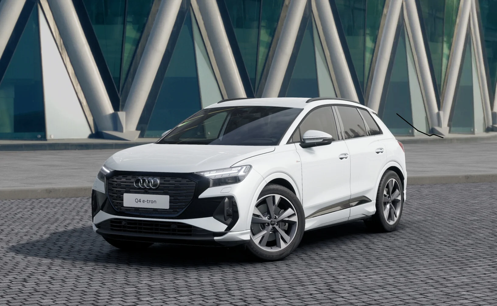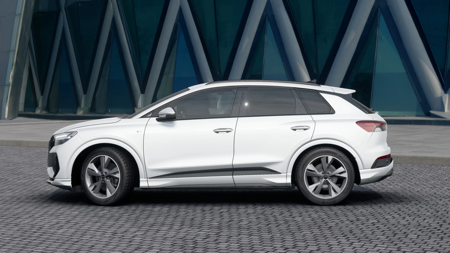 Z zewnątrz Audi Q4 40 e-tron prezentuje się nowocześnie i dynamicznie. Charakterystyczny grill Singleframe z podświetlanym logo marki harmonijnie współgra z smukłymi reflektorami LED, nadając pojazdowi futurystyczny wygląd. Proporcje nadwozia podkreślają sportowy charakter, a delikatne linie nadwozia przypominają o elegancji, jaką oferuje marka Audi.