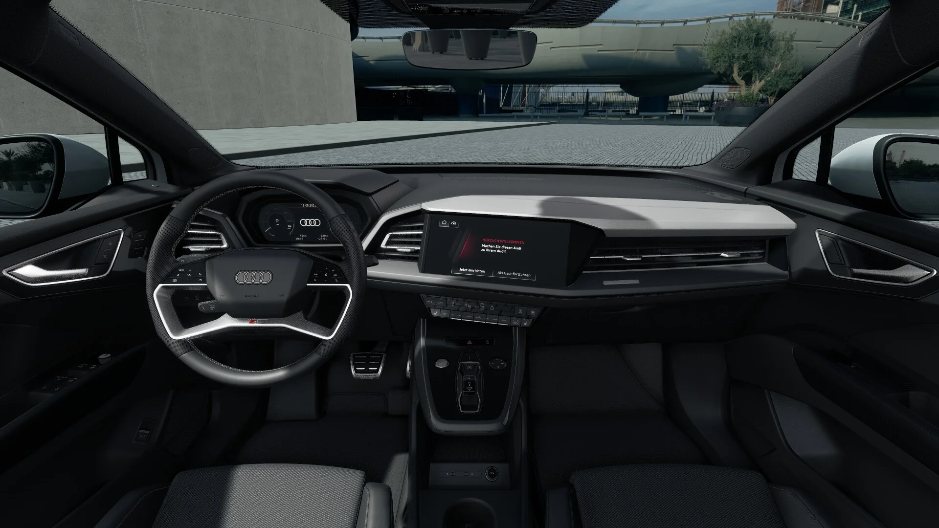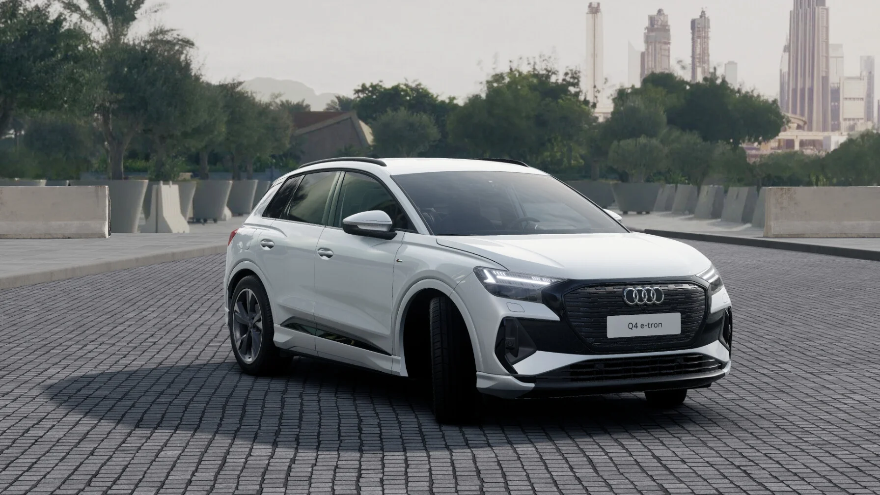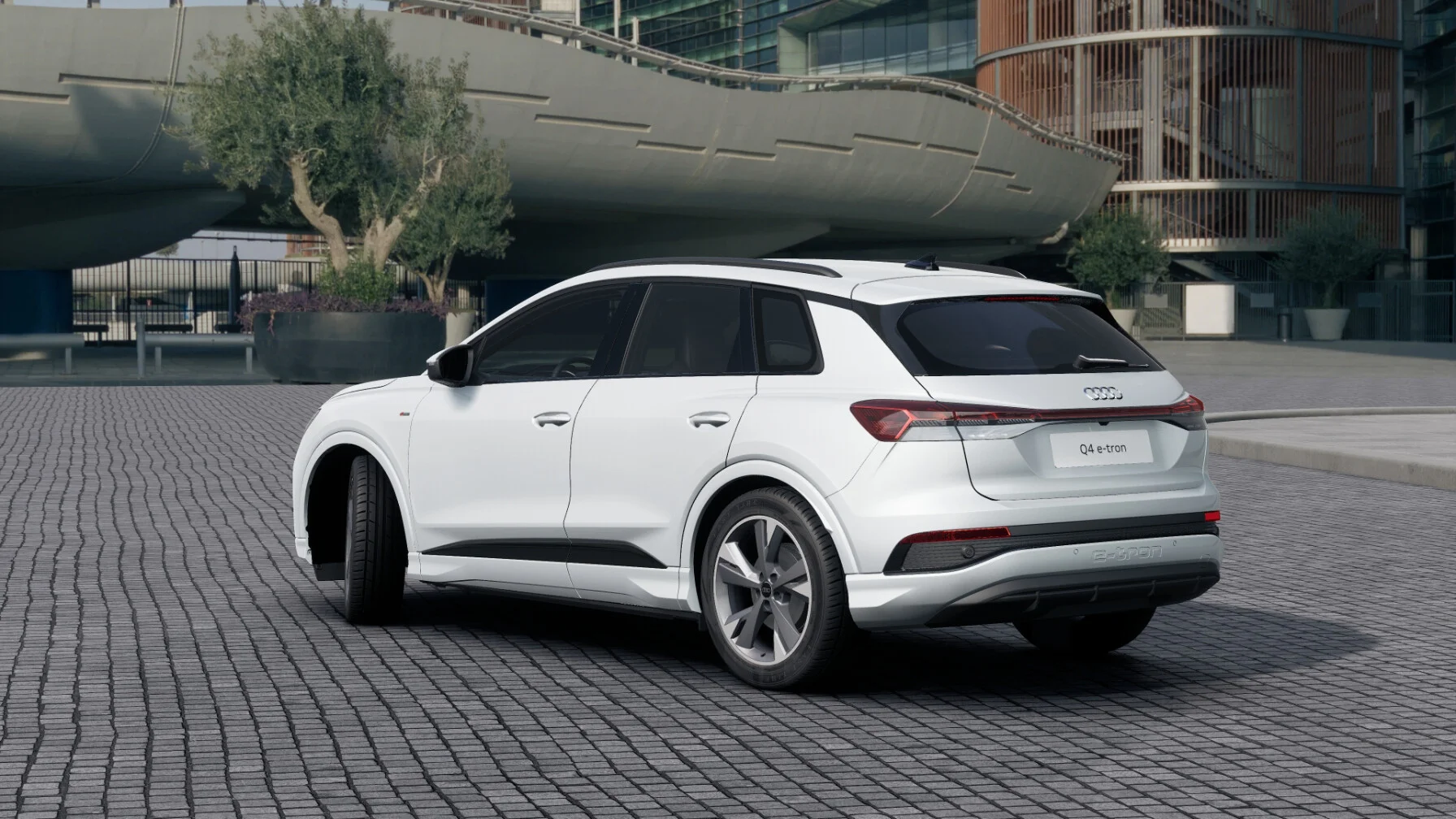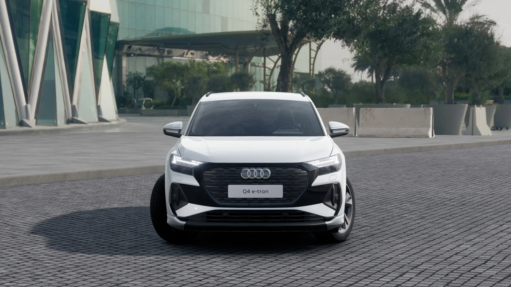 Z zewnątrz Audi Q4 40 e-tron prezentuje się nowocześnie i dynamicznie. Charakterystyczny grill Singleframe z podświetlanym logo marki harmonijnie współgra z smukłymi reflektorami LED, nadając pojazdowi futurystyczny wygląd. Proporcje nadwozia podkreślają sportowy charakter, a delikatne linie nadwozia przypominają o elegancji, jaką oferuje marka Audi.