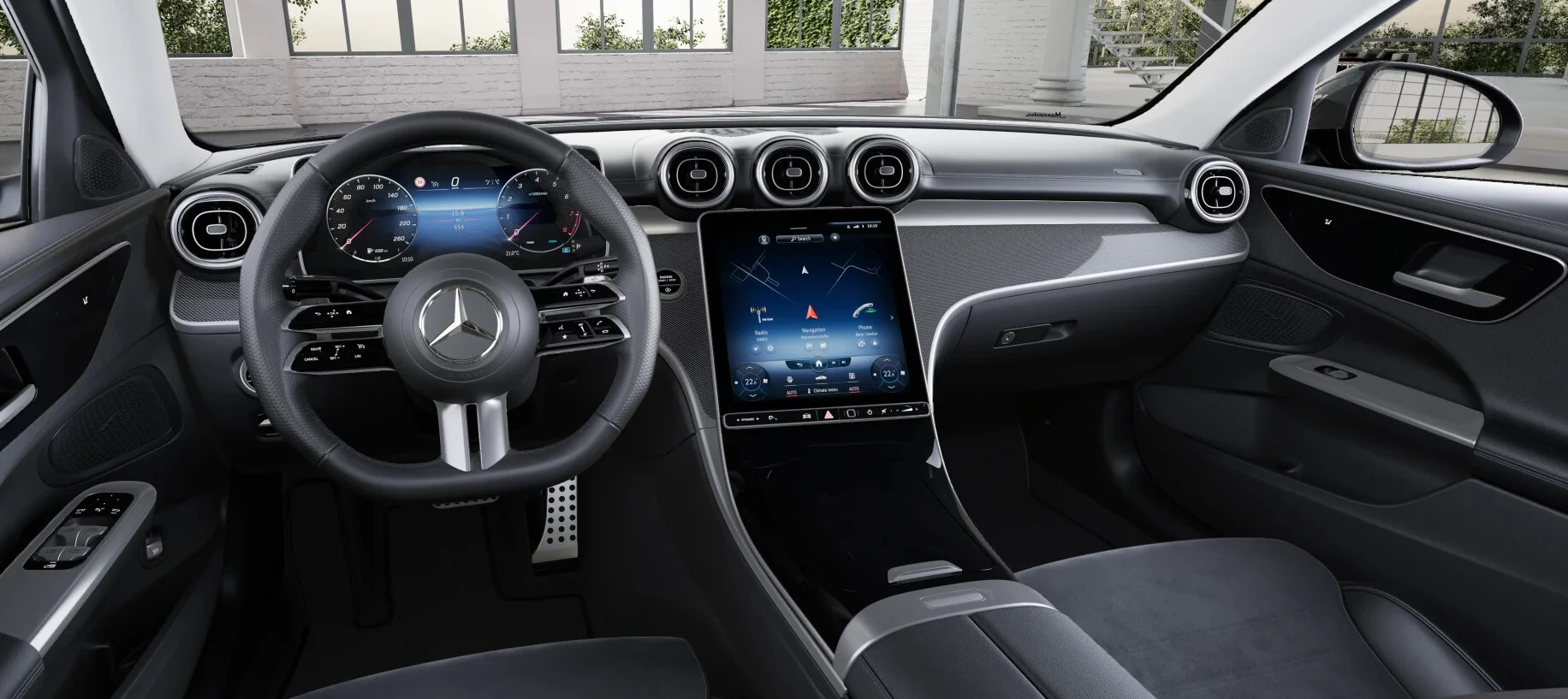 Wnętrze: Kabina Mercedes C 200 w pakiecie Advanced jest synonimem luksusu i zaawansowanej technologii. Wysokiej jakości materiały, takie jak skórzane wykończenia i dekoracyjne elementy z aluminium, tworzą eleganckie i komfortowe wnętrze. Siedzenia z możliwością elektrycznej regulacji zapewniają optymalne wsparcie i wygodę, a system multimedialny MBUX z dużym ekranem dotykowym oferuje intuicyjną obsługę oraz dostęp do licznych funkcji rozrywki i informacji.