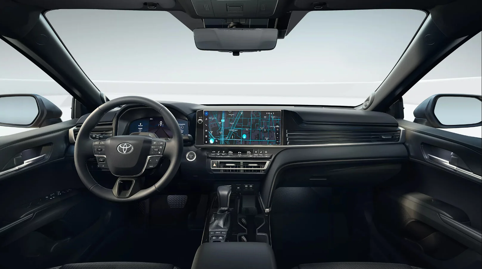 Wnętrze Toyota Camry to przestrzeń zaprojektowana z myślą o najwyższym komforcie i funkcjonalności. Kabina została wykończona wysokiej jakości materiałami, oferując ergonomiczne fotele, które zapewniają wyjątkowy komfort zarówno kierowcy, jak i pasażerom. Przestronne wnętrze oferuje dużo miejsca na nogi i głowę, co czyni każdą podróż przyjemnością. Nowoczesny system multimedialny z dużym ekranem dotykowym, nawigacją oraz integracją smartfona przez Apple CarPlay i Android Auto zapewnia łatwy dostęp do wszystkich funkcji pojazdu, a cyfrowy kokpit oferuje intuicyjny dostęp do informacji o pojeździe.