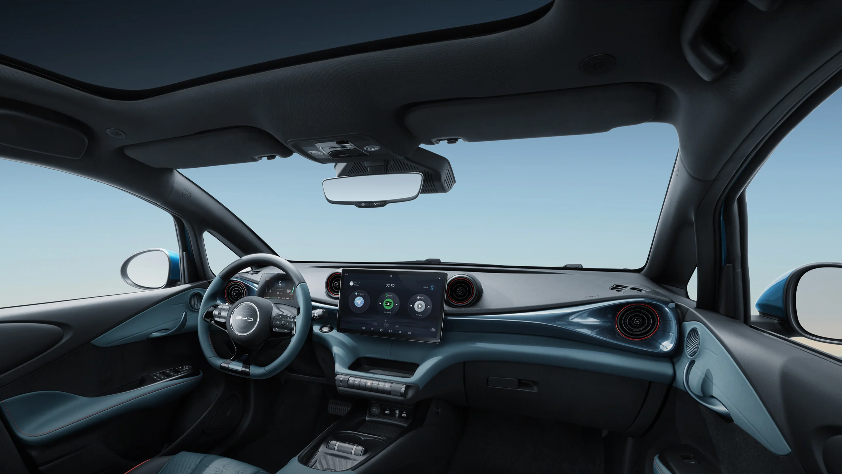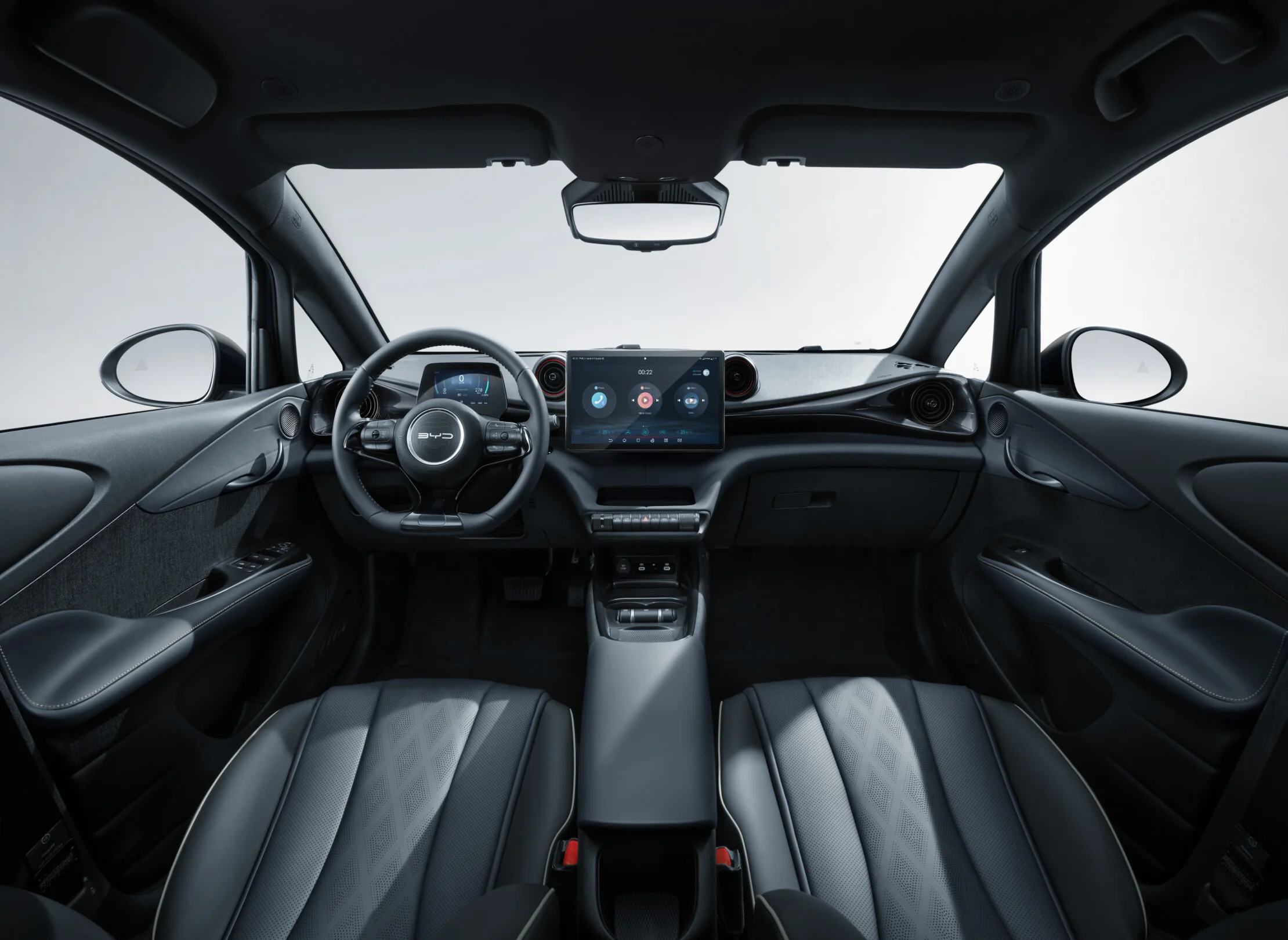 Wnętrze BYD Dolphin Comfort zostało zaprojektowane z myślą o komforcie i funkcjonalności. Przestronna kabina oferuje wysokiej jakości materiały, ergonomiczne fotele i przemyślane rozwiązania, które zapewniają wygodę zarówno kierowcy, jak i pasażerom. Nowoczesny system multimedialny z dużym ekranem dotykowym, nawigacją oraz integracją smartfona poprzez Apple CarPlay i Android Auto zapewnia łatwy dostęp do wszystkich funkcji pojazdu. Cyfrowy kokpit oferuje intuicyjny dostęp do informacji o pojeździe, zwiększając komfort i bezpieczeństwo jazdy.