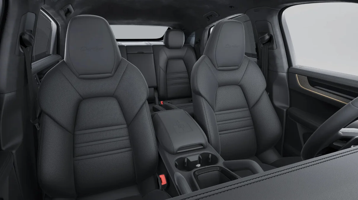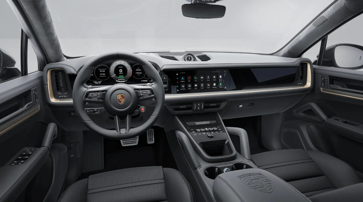 Wnętrze Porsche Cayenne Turbo E-Hybrid Coupé z pakietem GT zostało zaprojektowane z myślą o najwyższym komforcie i funkcjonalności. Przestronna kabina oferuje najwyższej jakości materiały, ergonomiczne fotele wykończone skórą i Alcantarą oraz przemyślane rozwiązania, które zapewniają wygodę zarówno kierowcy, jak i pasażerom. Nowoczesny system multimedialny Porsche Communication Management (PCM) z dużym ekranem dotykowym, nawigacją oraz integracją smartfona poprzez Apple CarPlay i Android Auto zapewnia łatwy dostęp do wszystkich funkcji pojazdu. Cyfrowy kokpit z wyświetlaczem TFT oferuje intuicyjny dostęp do informacji o pojeździe, zwiększając komfort i bezpieczeństwo jazdy.