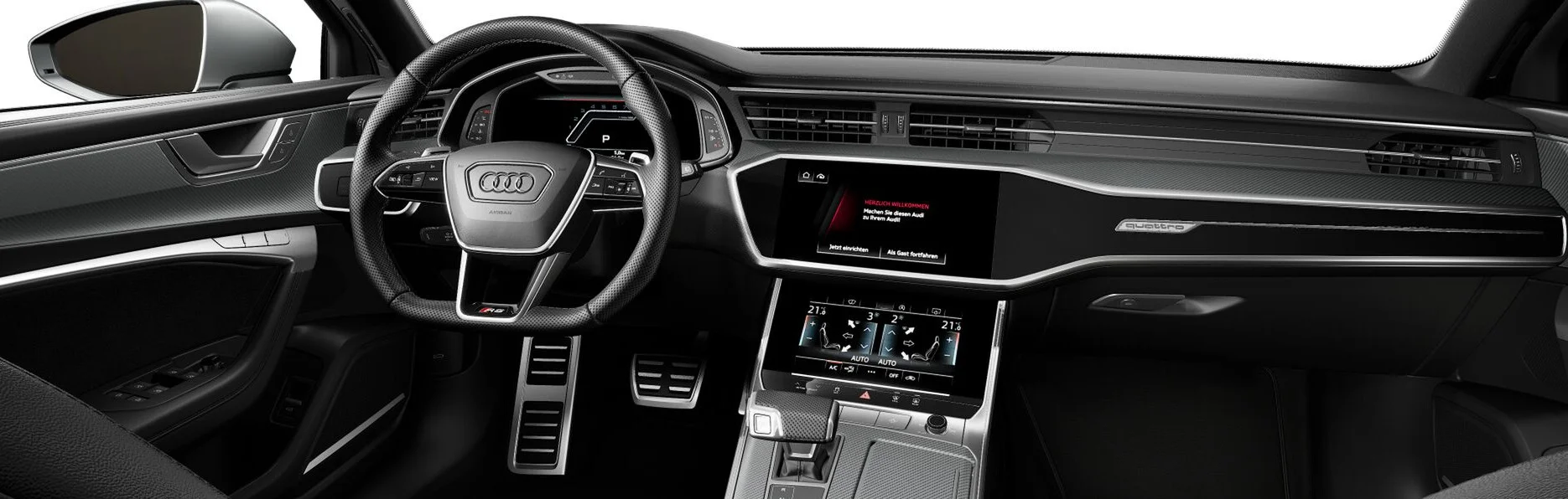 Wnętrze Audi RS6 Avant zostało zaprojektowane z myślą o najwyższym komforcie i sportowym duchu. Przestronna kabina oferuje sportowe fotele RS z wyraźnym logotypem RS, wykończone najwyższej jakości skórą Valcona i Alcantarą, które zapewniają doskonałe podparcie podczas dynamicznej jazdy. Kierownica RS z perforowaną skórą, przyciskami RS Mode i łopatkami do zmiany biegów, gwarantuje precyzyjne prowadzenie. Nowoczesny system multimedialny MMI Navigation Plus z dużym ekranem dotykowym, nawigacją oraz integracją smartfona poprzez Apple CarPlay i Android Auto, zapewnia pełną kontrolę nad funkcjami pojazdu. Cyfrowy kokpit Audi Virtual Cockpit Plus z interfejsem RS oferuje personalizowane ustawienia, które zwiększają komfort i bezpieczeństwo jazdy.