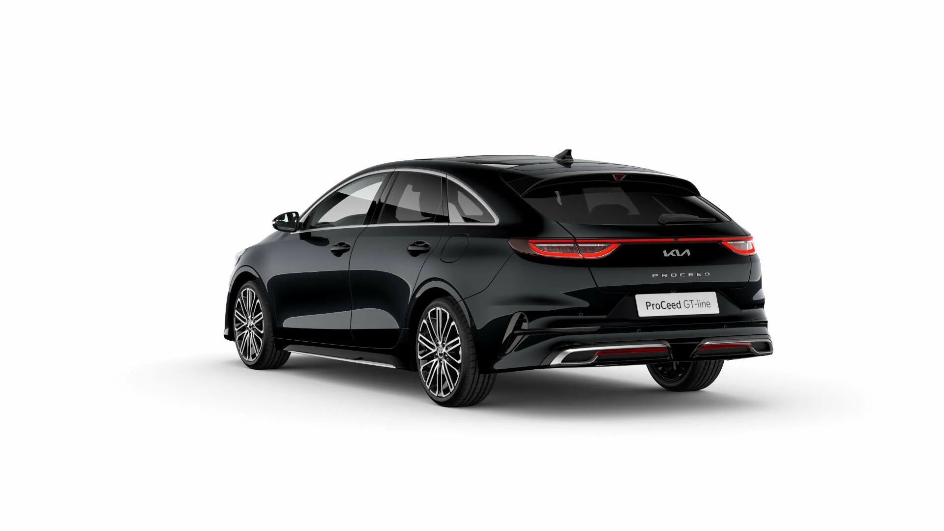 Zewnętrzny wygląd Kia ProCeed GT Line wyróżnia się agresywnymi i eleganckimi liniami, które podkreślają jego sportowy charakter. Charakterystyczna opadająca linia dachu w stylu shooting brake, szeroki grill „tiger nose”, smukłe reflektory LED oraz aerodynamiczne zderzaki nadają pojazdowi wyrazisty i dynamiczny wygląd. Stylowe detale, takie jak 17-calowe felgi aluminiowe, sportowe wykończenia oraz podwójne końcówki wydechu, dodają samochodowi prestiżu i sportowego zacięcia.