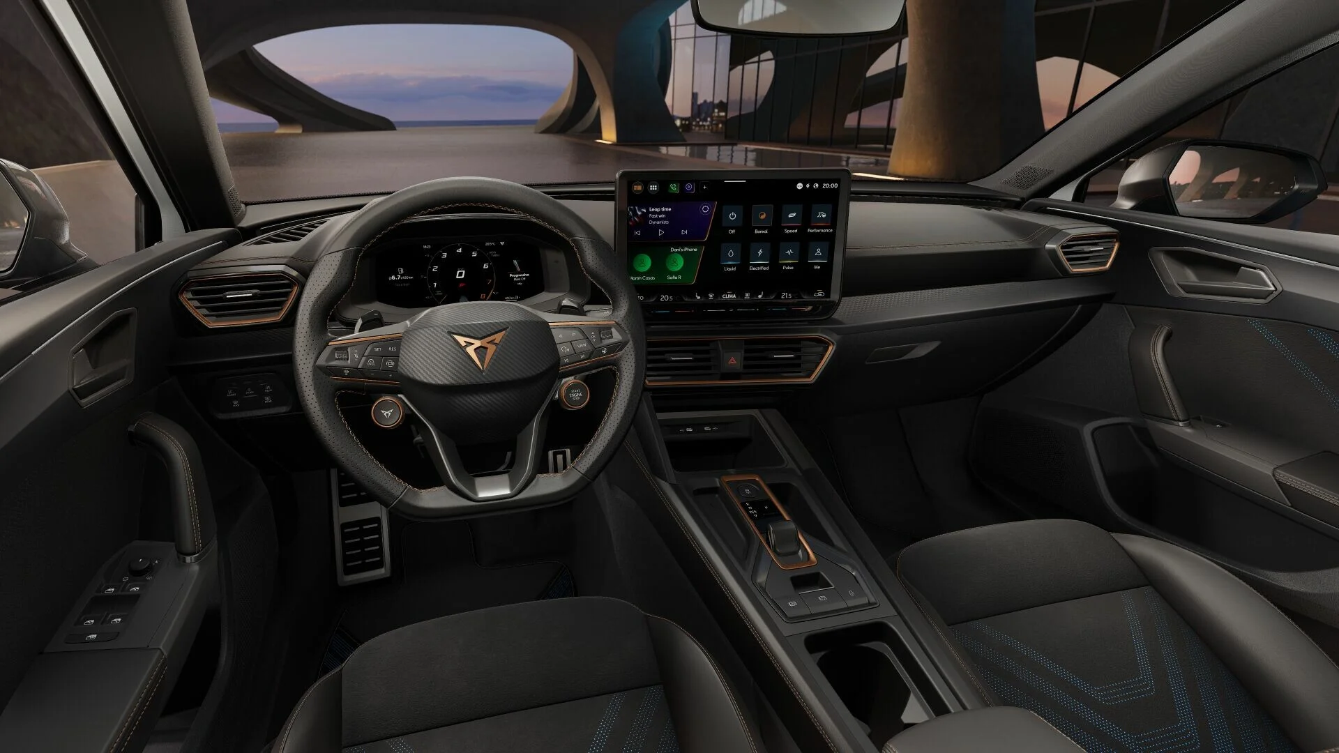 Wnętrze CUPRA Leon VZ 2.0 zostało zaprojektowane z myślą o najwyższym komforcie i sportowym duchu. Przestronna kabina oferuje sportowe fotele z wyraźnym logotypem CUPRA, wykończone najwyższej jakości materiałami, które zapewniają doskonałe podparcie podczas dynamicznej jazdy. Kierownica CUPRA z łopatkami do zmiany biegów oraz przyciskami CUPRA Mode gwarantuje precyzyjne prowadzenie i pełną kontrolę nad pojazdem. Nowoczesny system multimedialny z dużym ekranem dotykowym, nawigacją oraz integracją smartfona poprzez Apple CarPlay i Android Auto zapewnia pełną kontrolę nad funkcjami pojazdu. Cyfrowy kokpit oferuje personalizowane ustawienia, które zwiększają komfort i bezpieczeństwo jazdy.