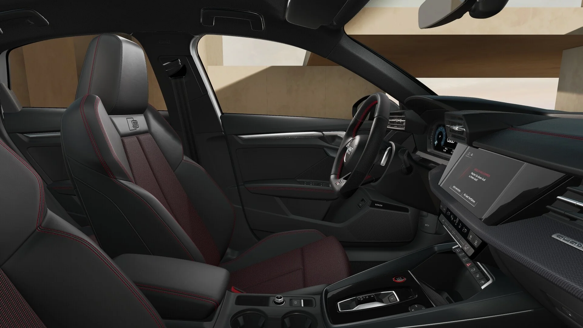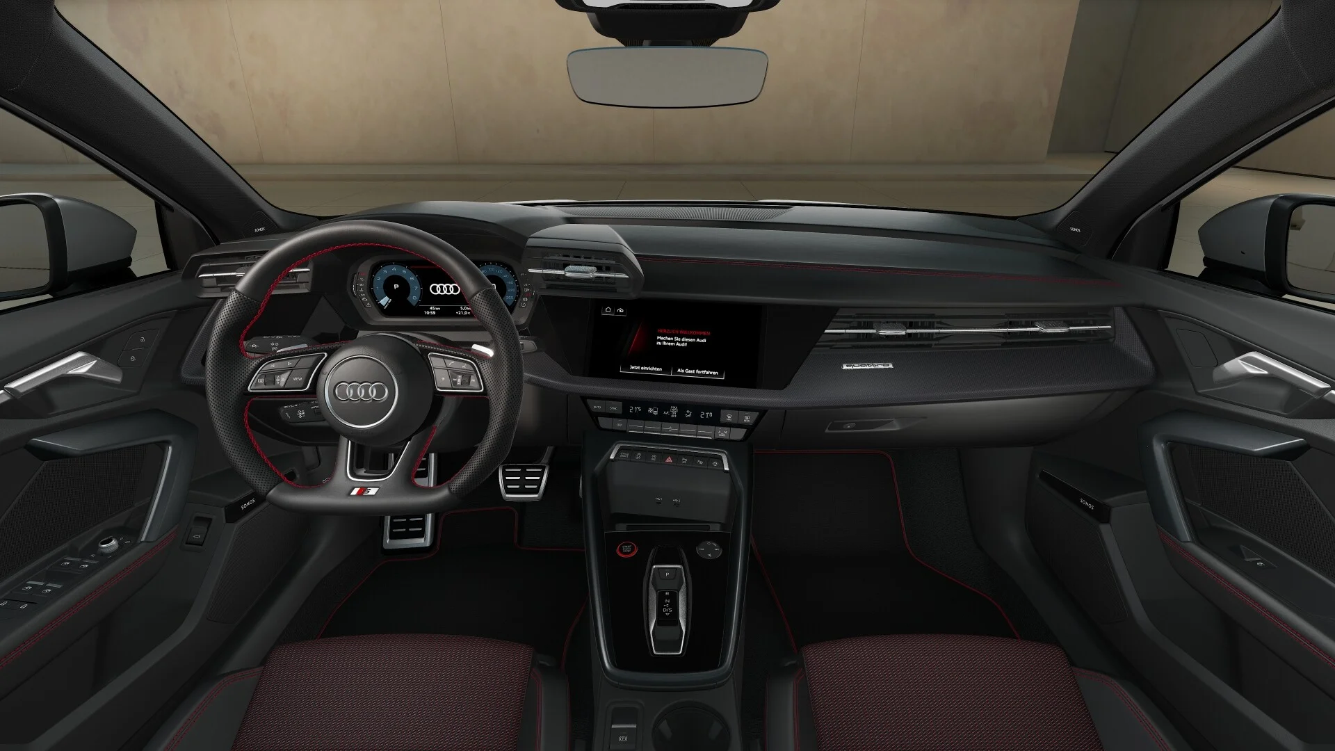 Wnętrze Audi S3 Limousine S tronic zostało zaprojektowane z myślą o najwyższym komforcie i sportowym duchu. Przestronna kabina oferuje najwyższej jakości materiały, sportowe fotele S z wyraźnym logotypem S, wykończone skórą i Alcantarą, które zapewniają doskonałe podparcie podczas dynamicznej jazdy. Kierownica S z perforowaną skórą, łopatkami do zmiany biegów oraz przyciskami Audi drive select, gwarantuje precyzyjne prowadzenie i pełną kontrolę nad pojazdem. Nowoczesny system multimedialny MMI Navigation Plus z dużym ekranem dotykowym, nawigacją oraz integracją smartfona poprzez Apple CarPlay i Android Auto, zapewnia łatwy dostęp do wszystkich funkcji pojazdu. Cyfrowy kokpit Audi Virtual Cockpit Plus oferuje personalizowane ustawienia, które zwiększają komfort i bezpieczeństwo jazdy.