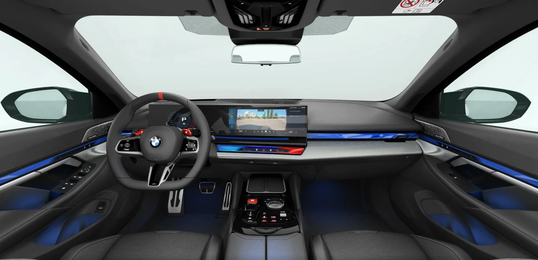 Wnętrze BMW M5 Touring to przestrzeń stworzona z myślą o luksusie i komforcie. Kabina wykończona jest materiałami najwyższej jakości, takimi jak skóra Merino i drewno, co tworzy elegancką atmosferę. Ergonomiczne fotele sportowe oferują doskonałe wsparcie, a przestronność kabiny zapewnia komfort zarówno dla kierowcy, jak i pasażerów. Na pokładzie znajduje się zaawansowany system multimedialny iDrive z dużym ekranem dotykowym, który obsługuje nawigację, multimedia oraz integrację z Apple CarPlay i Android Auto, co zapewnia łatwy dostęp do ulubionych aplikacji.