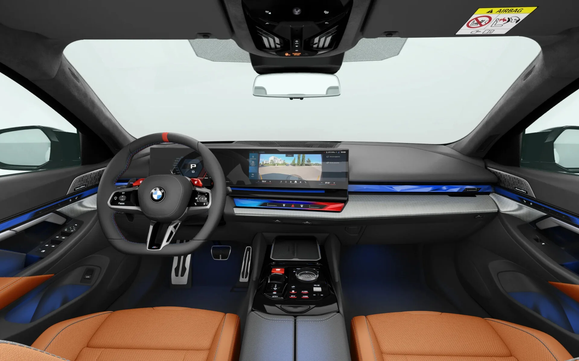 Wnętrze BMW M5 Touring to przestrzeń stworzona z myślą o luksusie i komforcie. Kabina wykończona jest materiałami najwyższej jakości, takimi jak skóra Merino i drewno, co tworzy elegancką atmosferę. Ergonomiczne fotele sportowe oferują doskonałe wsparcie, a przestronność kabiny zapewnia komfort zarówno dla kierowcy, jak i pasażerów. Na pokładzie znajduje się zaawansowany system multimedialny iDrive z dużym ekranem dotykowym, który obsługuje nawigację, multimedia oraz integrację z Apple CarPlay i Android Auto, co zapewnia łatwy dostęp do ulubionych aplikacji.