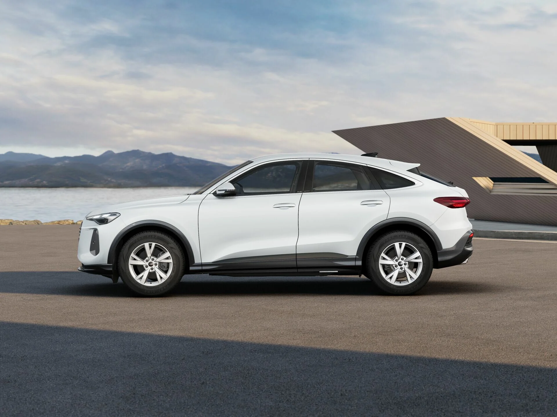 Audi Q5 Sportback wyróżnia się dynamiczną, coupe-typu sylwetką, która nadaje mu sportowego charakteru, zachowując jednocześnie przestronność, jaką oferuje klasyczny SUV. Opływowe linie nadwozia, smukłe reflektory LED, wyrazisty grill oraz delikatnie opadająca linia dachu sprawiają, że Q5 Sportback wygląda niezwykle elegancko i nowocześnie. Z boku pojazdu widoczne są wyraziste nadkola, które podkreślają szeroką sylwetkę auta, a 19-calowe felgi aluminiowe i chromowane akcenty dodają pojazdowi prestiżowego wyglądu. Tył pojazdu również nie ustępuje w estetyce, z charakterystycznym spoilerem i eleganckimi reflektorami, które podkreślają sportowy charakter pojazdu.