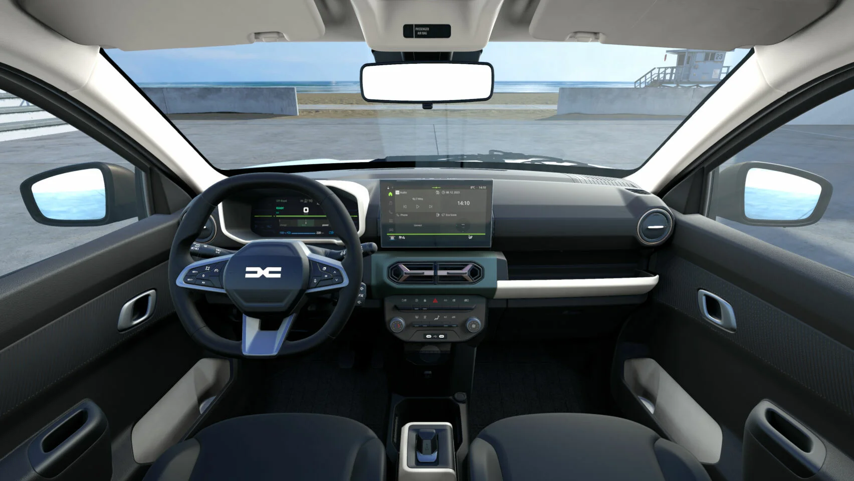 Wnętrze Dacii Spring to przestronność i praktyczność. Choć samochód jest kompaktowy, kabina oferuje wystarczającą ilość miejsca dla kierowcy i pasażerów, a prosta, ale nowoczesna deska rozdzielcza jest funkcjonalna i łatwa w obsłudze. System multimedialny z ekranem dotykowym umożliwia dostęp do nawigacji, multimediów oraz integrację z urządzeniami mobilnymi za pomocą Apple CarPlay i Android Auto. Pojazd oferuje także liczne schowki, co zwiększa przestronność kabiny. Bagażnik o pojemności 290 litrów zapewnia wystarczającą przestronność do codziennych zakupów oraz drobnych podróży.