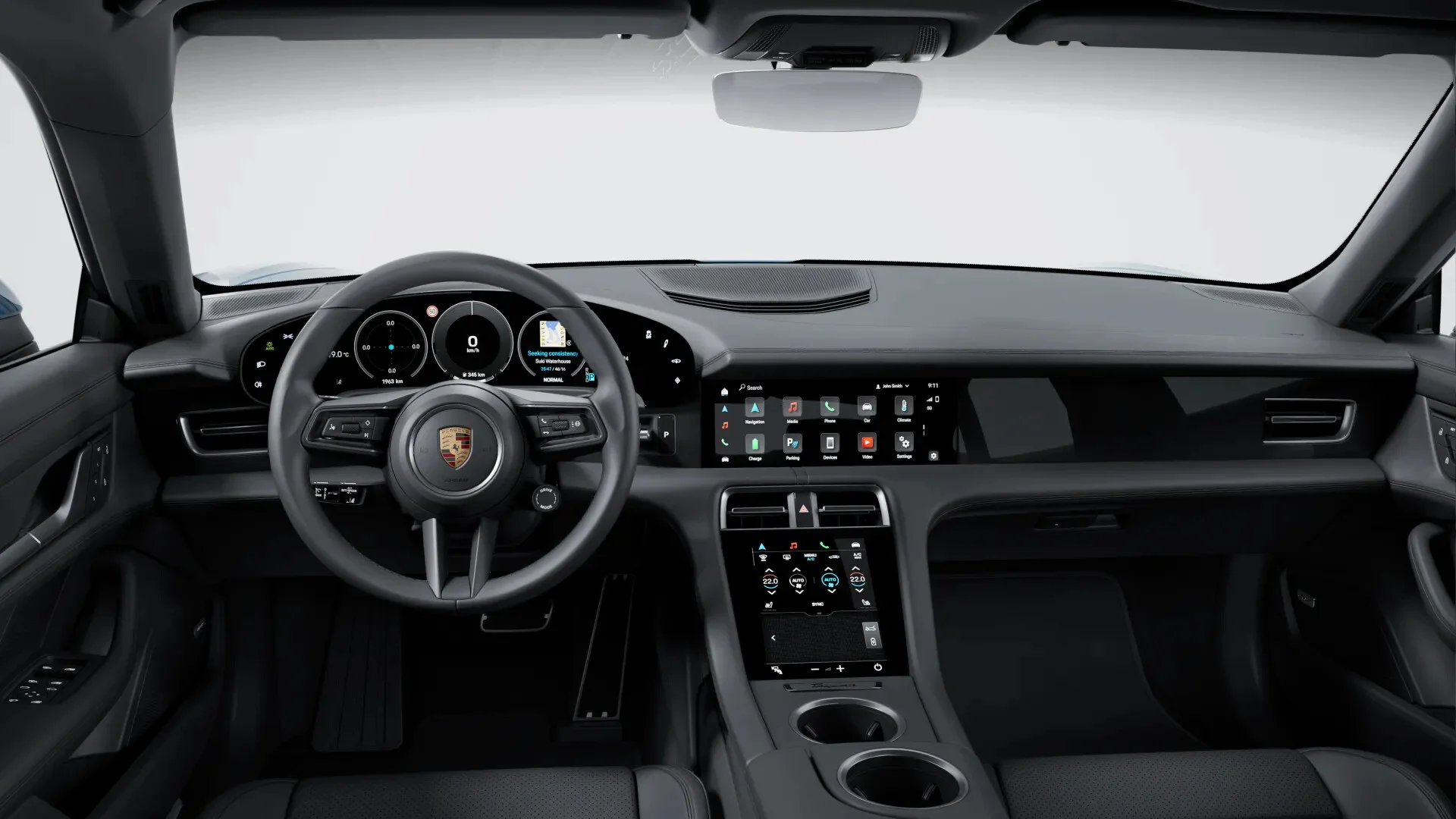 Wnętrze Porsche Taycan to przykład luksusowego wykonania i nowoczesnych rozwiązań. Kabina jest przestronna i wykończona materiałami najwyższej jakości, takimi jak skóra, aluminium i włókno węglowe, co tworzy ekskluzywną atmosferę. Fotele sportowe oferują doskonałe wsparcie, a ergonomiczna deska rozdzielcza z centralnym ekranem dotykowym zapewnia łatwy dostęp do wszystkich funkcji pojazdu. Na pokładzie znajduje się zaawansowany system multimedialny, który obsługuje nawigację, system audio i integrację z urządzeniami mobilnymi przez Apple CarPlay i Android Auto. Taycan to także przestronny pojazd, z pojemnym bagażnikiem, który zapewnia odpowiednią ilość miejsca na bagaże oraz codzienne zakupy.