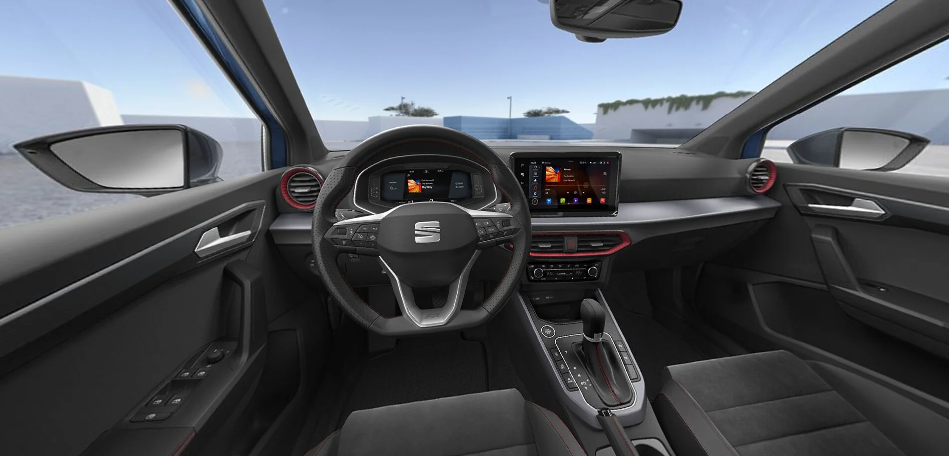 Wnętrze Seat Arona FR to połączenie komfortu, sportowego charakteru i nowoczesnych technologii. Kabina została wykończona materiałami wysokiej jakości, takimi jak skórzane akcenty i tkaniny o sportowym designie. Fotele sportowe zapewniają doskonałe wsparcie, a przestronność wnętrza gwarantuje komfort dla kierowcy i pasażerów. Na pokładzie znajduje się system multimedialny z ekranem dotykowym o przekątnej 8 cali, który obsługuje nawigację, multimedia oraz integrację z urządzeniami mobilnymi za pomocą Apple CarPlay i Android Auto. Dodatkowo, system audio oferuje doskonałą jakość dźwięku, co zapewnia przyjemność z podróży. Bagażnik o pojemności 400 litrów oferuje wystarczającą przestronność na codzienne zakupy i bagaże.