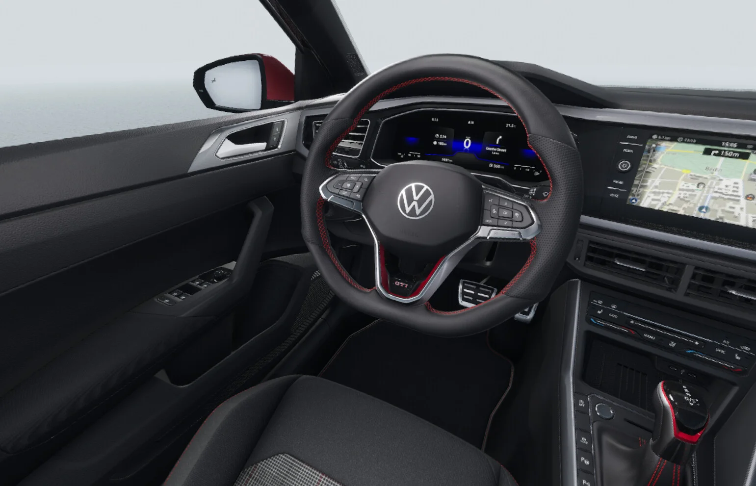 Wnętrze Volkswagena Polo GTI to przestronność i sportowy klimat. Fotele z charakterystycznym wykończeniem GTI zapewniają komfort i wsparcie podczas dynamicznej jazdy, a nowoczesne wykończenia wnętrza, takie jak skórzane akcenty i elementy wykończone aluminium, nadają kabinie sportowy charakter. Na pokładzie znajduje się system multimedialny z 8-calowym ekranem dotykowym, który obsługuje nawigację, multimedia oraz integrację z urządzeniami mobilnymi za pomocą Apple CarPlay i Android Auto. Dodatkowo, Polo GTI oferuje system audio, który zapewnia wysoką jakość dźwięku, a przestronny bagażnik o pojemności 355 litrów daje wystarczającą ilość miejsca na bagaże i zakupy.