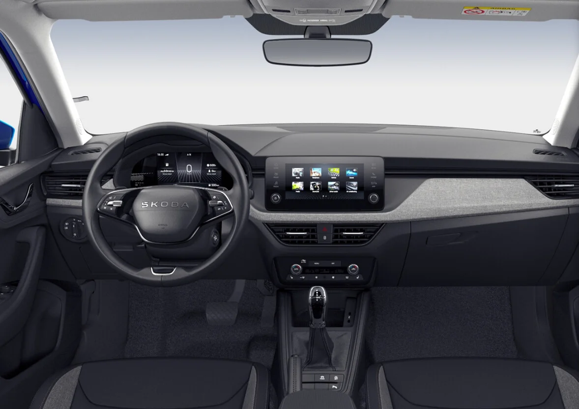 Wnętrze Skody Scali 1.0 TSI to przestronność, komfort i nowoczesne technologie. Kabina została zaprojektowana z myślą o wygodzie kierowcy oraz pasażerów. Fotele oferują wygodę na długich trasach, a nowoczesne materiały wykończeniowe nadają wnętrzu elegancki wygląd. Na pokładzie znajduje się system multimedialny z ekranem dotykowym o przekątnej 8 cali, który obsługuje nawigację, multimedia oraz integrację z urządzeniami mobilnymi za pomocą Apple CarPlay i Android Auto. Dodatkowo, system audio zapewnia doskonałą jakość dźwięku, a klimatyzacja automatyczna utrzymuje odpowiednią temperaturę wewnątrz pojazdu. Pojazd oferuje przestronny bagażnik o pojemności 467 litrów, co zapewnia dużą ilość miejsca na bagaże i zakupy.
