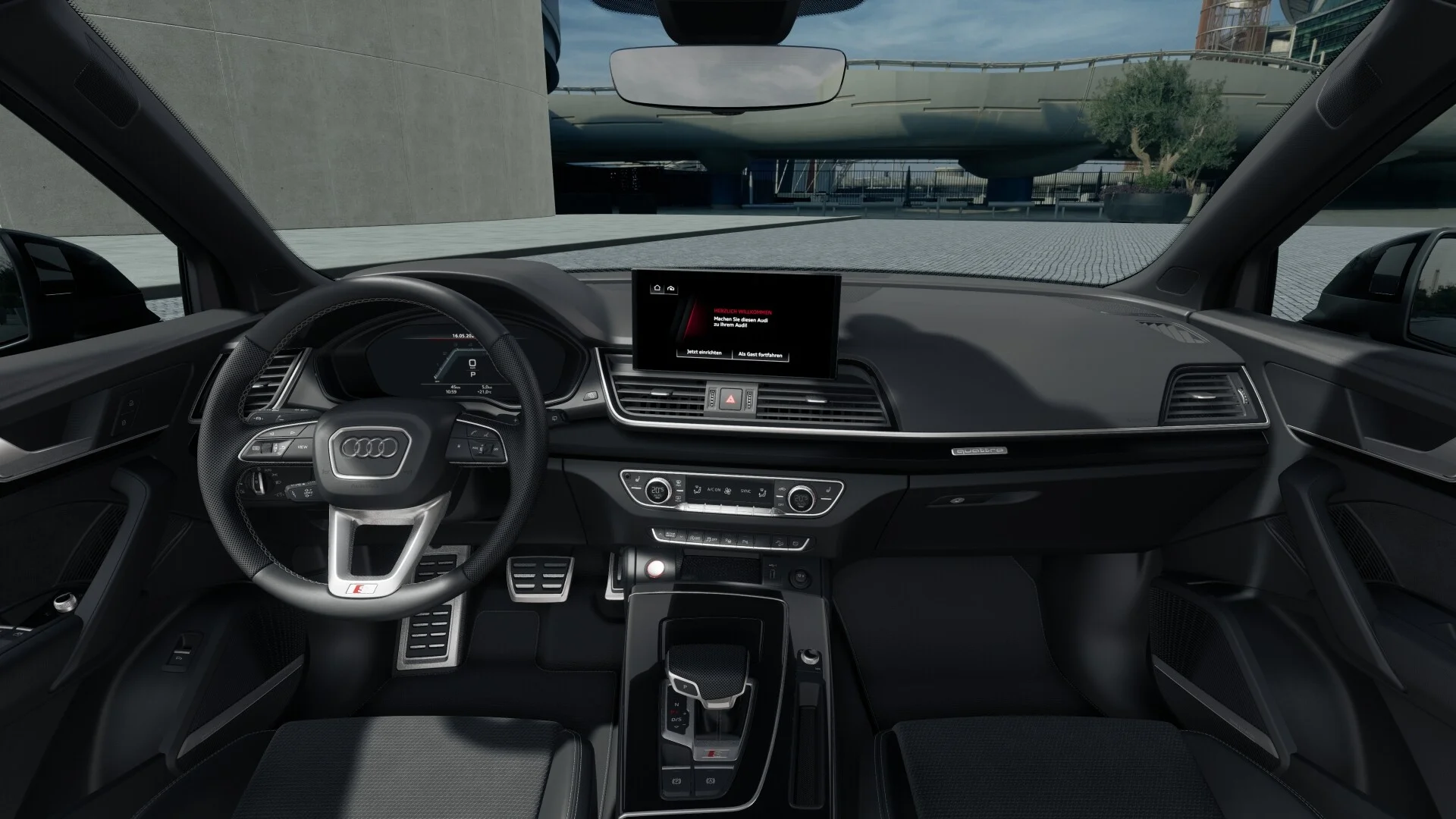 Wnętrze Audi SQ5 TDI oferuje najwyższy poziom komfortu, przestronności i nowoczesnych technologii. Kabina pojazdu została zaprojektowana z myślą o komforcie kierowcy oraz pasażerów. Fotele sportowe z tapicerką skórzaną oraz alcantarą zapewniają wygodę i odpowiednią ergonomię na długich trasach. Na pokładzie znajduje się system multimedialny MMI z ekranem dotykowym 8,3 cala, który obsługuje nawigację, multimedia oraz integrację z urządzeniami mobilnymi za pomocą Apple CarPlay i Android Auto. Dodatkowo, system audio Bang & Olufsen zapewnia doskonałą jakość dźwięku, a automatyczna klimatyzacja 3-strefowa utrzymuje odpowiednią temperaturę wewnątrz pojazdu. Pojazd oferuje przestronny bagażnik o pojemności 510 litrów, co zapewnia dużą ilość miejsca na bagaże i zakupy.