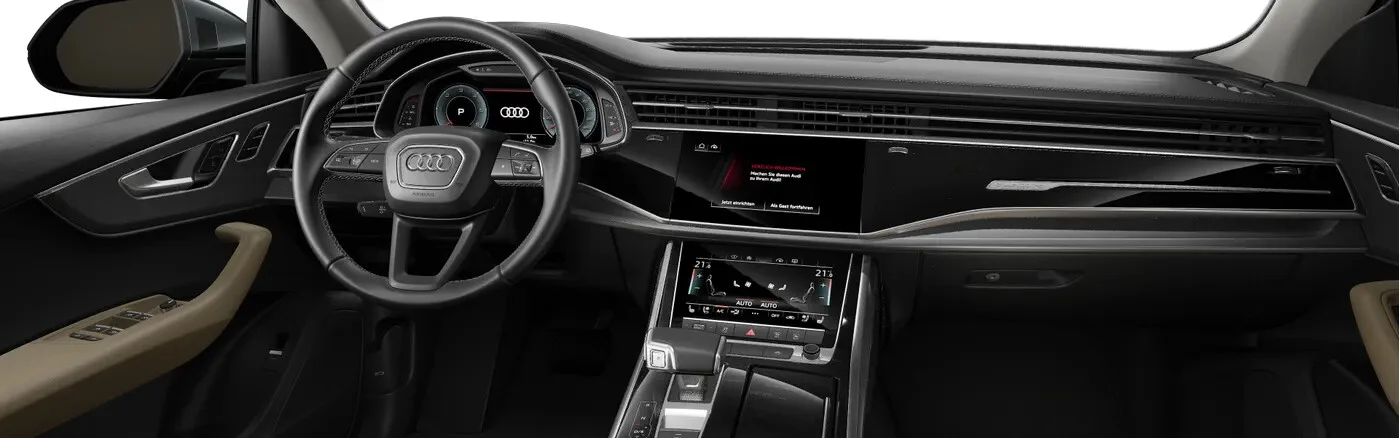 We wnętrzu znajdziesz najwyższą jakość wykonania, luksusowe materiały oraz przestrzeń dla pięciu lub siedmiu pasażerów (opcjonalny trzeci rząd siedzeń). Dwa duże ekrany dotykowe MMI Touch, wirtualny kokpit oraz opcjonalny system audio Bang & Olufsen tworzą zaawansowane centrum dowodzenia na kołach.