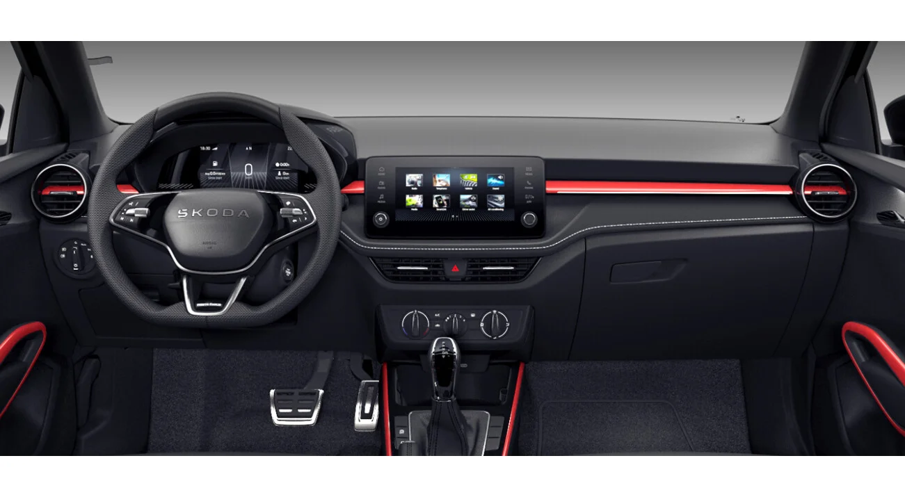Wnętrze Fabii Monte Carlo zaprojektowano z naciskiem na sportowy styl i ergonomię. Sportowe fotele z czerwonymi przeszyciami, czarna podsufitka oraz wstawki imitujące włókno węglowe tworzą dynamiczną atmosferę. System multimedialny z ekranem dotykowym oraz cyfrowy zestaw wskaźników zapewniają intuicyjną obsługę i pełną łączność ze smartfonem.