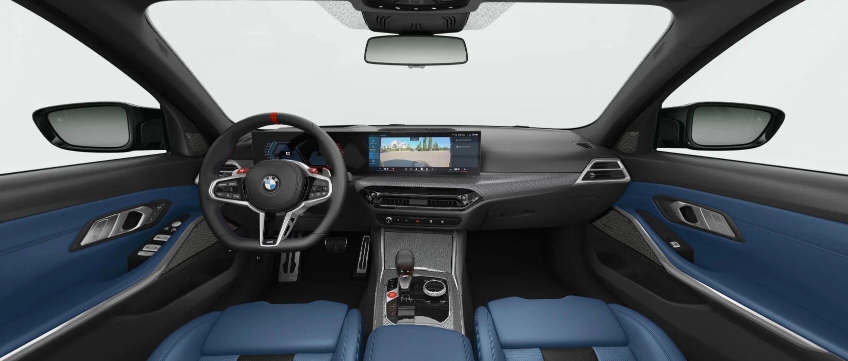 Wnętrze BMW M3 Touring to przestrzeń stworzona z myślą o luksusie i komforcie. Kabina wykończona jest materiałami najwyższej jakości, takimi jak skóra Merino oraz elementy z włókna węglowego, co tworzy elegancką atmosferę. Ergonomiczne fotele sportowe oferują doskonałe wsparcie, a przestronność kabiny zapewnia komfort zarówno dla kierowcy, jak i pasażerów. Na pokładzie znajduje się zaawansowany system multimedialny iDrive z dużym ekranem dotykowym, który obsługuje nawigację, multimedia oraz integrację z Apple CarPlay i Android Auto, co zapewnia łatwy dostęp do ulubionych aplikacji.