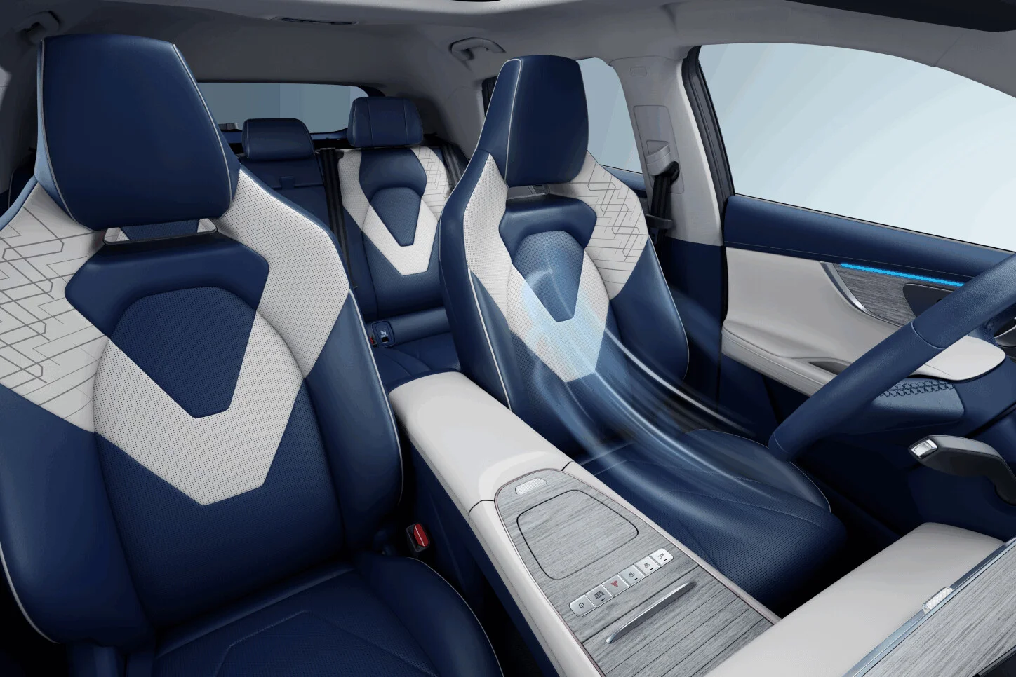 We wnętrzu kierowcę i pasażerów witają dwa duże zakrzywione ekrany o przekątnej 12,3 cala każdy, sterujące m.in. systemem multimedialnym i klimatyzacją. Bezprzewodowy Android Auto™ i Apple CarPlay™, ładowarka indukcyjna o mocy 50W, a także system audio SONY z 8 głośnikami zapewniają przyjemność z każdej podróży. Wnętrze wzbogacają podgrzewane i wentylowane fotele przednie, podgrzewana tylna kanapa oraz ambientowe oświetlenie z możliwością wyboru koloru.