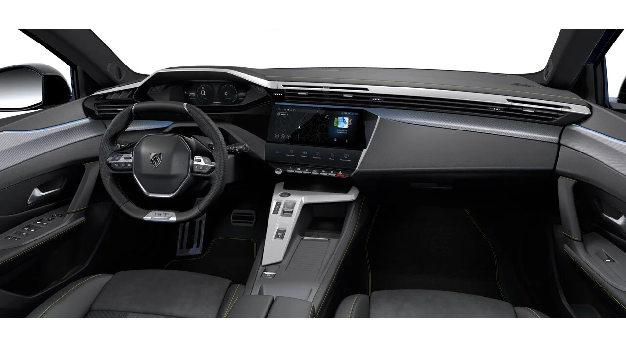 Wnętrze wersji GT to połączenie technologii i komfortu. Sportowe fotele z materiałowo-skórzaną tapicerką, ambientowe oświetlenie, cyfrowy kokpit 3D i 10-calowy ekran dotykowy systemu infotainment zapewniają pełną kontrolę nad autem i wrażenie premium. Peugeot i-Cockpit z kompaktową kierownicą poprawia ergonomię i podkreśla sportowy charakter wnętrza.