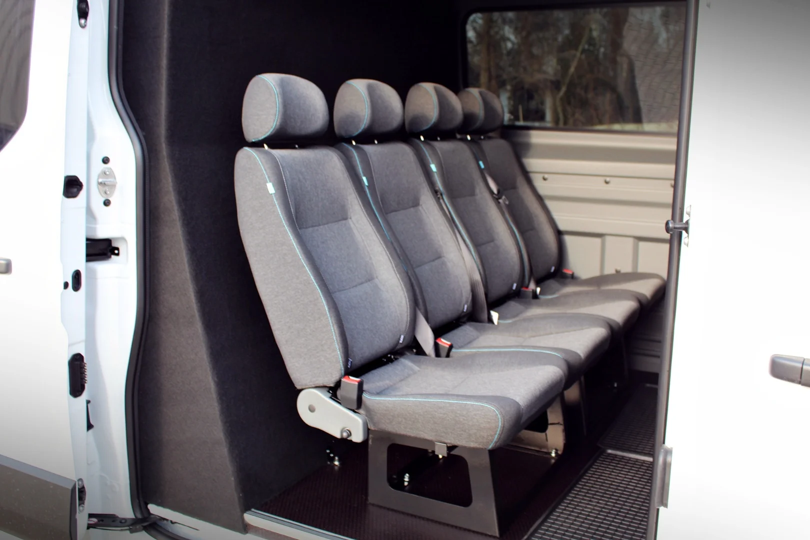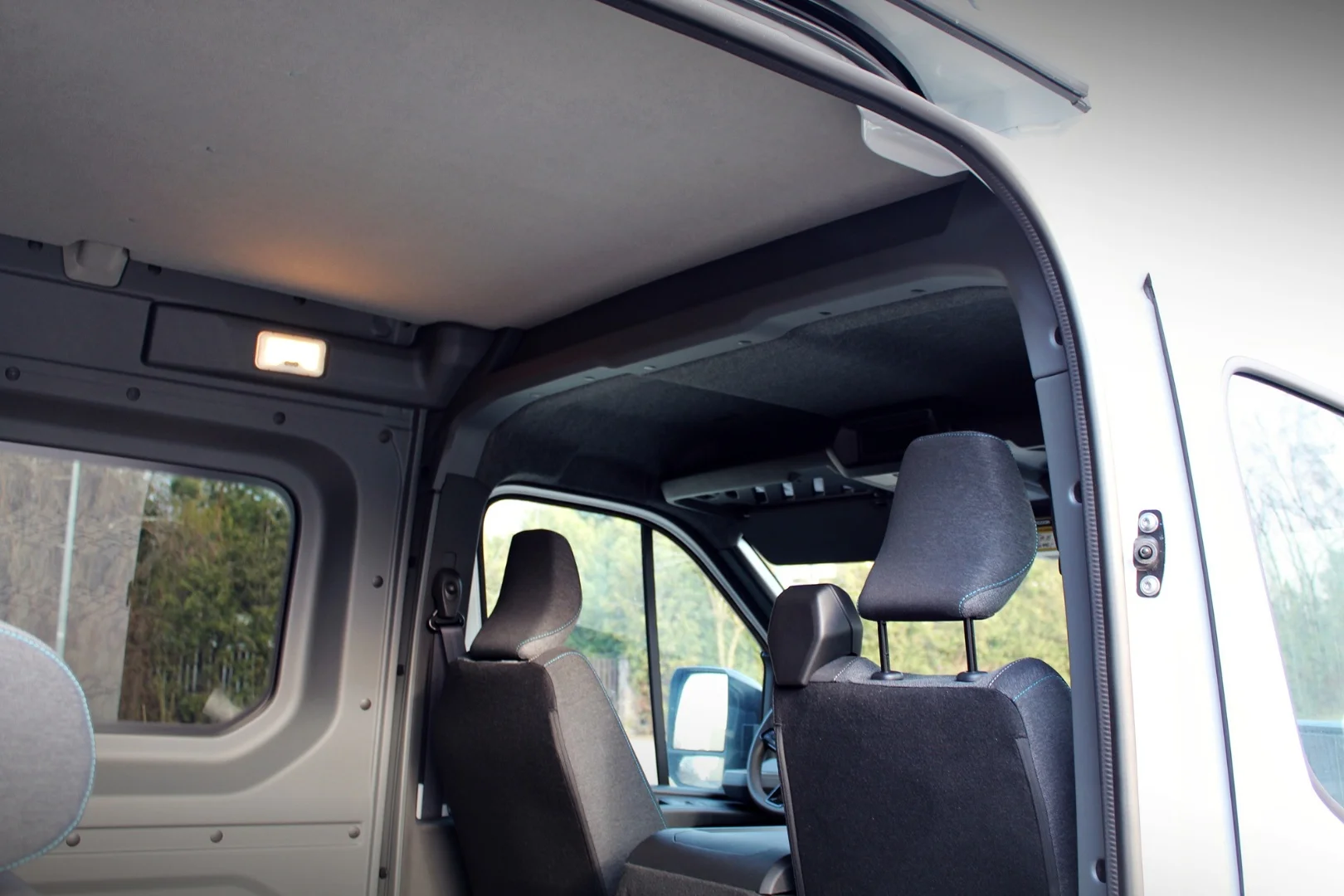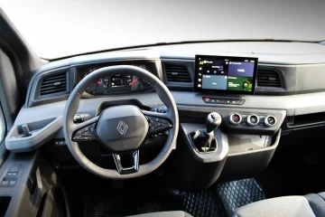 Wnętrze zostało zaprojektowane z myślą o codziennej pracy – trwałe materiały, wiele schowków oraz wygodne fotele sprawiają, że nawet dłuższe trasy nie są uciążliwe. Przegroda oddzielająca kabinę pasażerską od przestrzeni ładunkowej zwiększa bezpieczeństwo i organizację wnętrza.