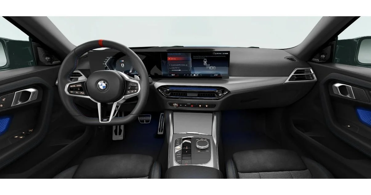 Kabina M240i Coupé łączy elegancję premium z wyraźnym sportowym akcentem. Fotele sportowe z mocnym trzymaniem bocznym, obszyta skórą kierownica M i wysokiej jakości materiały tworzą atmosferę prawdziwego auta dla kierowcy. Cyfrowe zegary i duży ekran multimedialny z intuicyjnym systemem obsługi dopełniają całość.