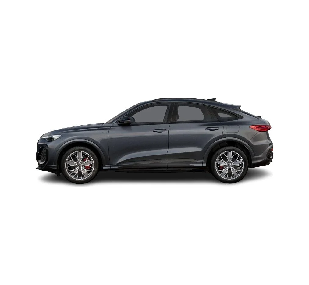 Audi Q5 Sportback e-hybrid wyróżnia się charakterystyczną sylwetką coupé, która nadaje mu sportowego charakteru. Szary lakier Tambora metalik oraz pakiet optyczny Czerń plus podkreślają elegancki wygląd auta. S-line Exterieur dodaje agresywnych akcentów, które świetnie współgrają z dynamicznymi proporcjami SUV-a. To samochód, który łączy prestiż i funkcjonalność w nowoczesnej formie.