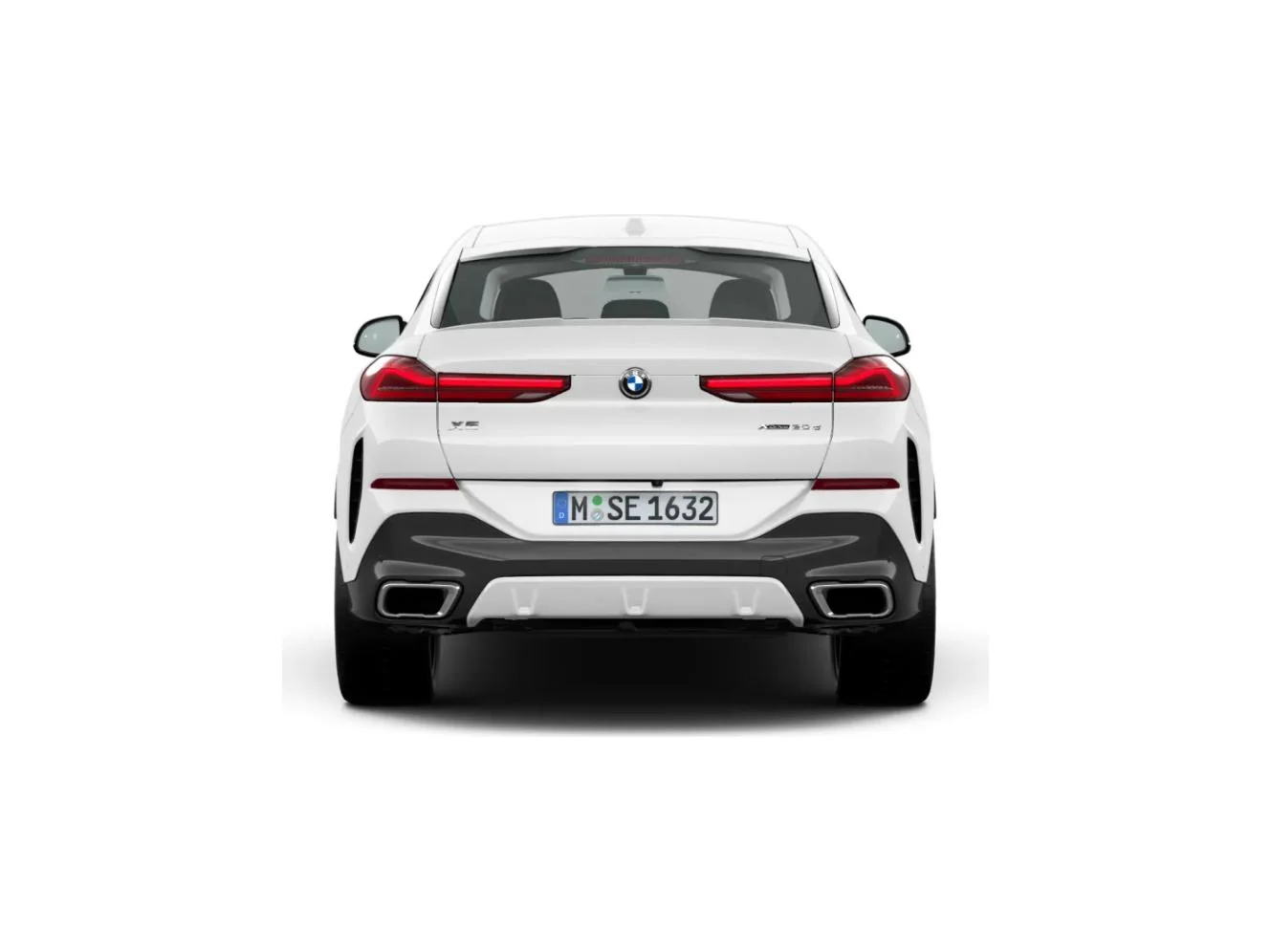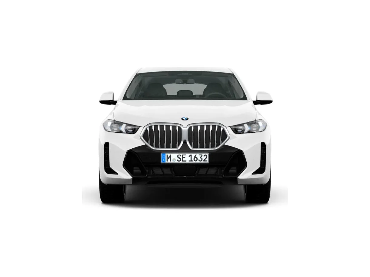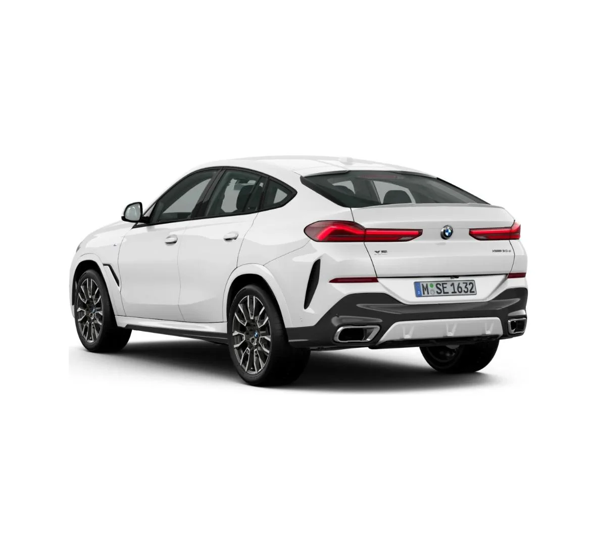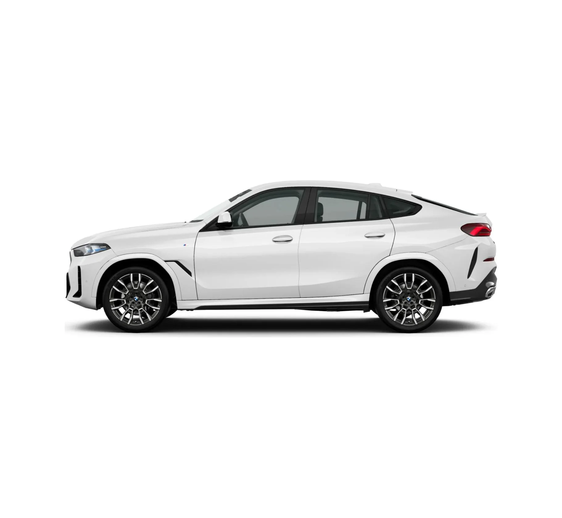 BMW X6 xDrive30d w linii podstawowej prezentuje typową dla tego modelu muskularną sylwetkę SUV-a coupe. Biały lakier Alpejski w połączeniu z 21-calowymi felgami M V-spoke w dwukolorowym wykończeniu podkreśla elegancję i sportowy charakter auta. To połączenie stylu premium z funkcjonalnością na co dzień.