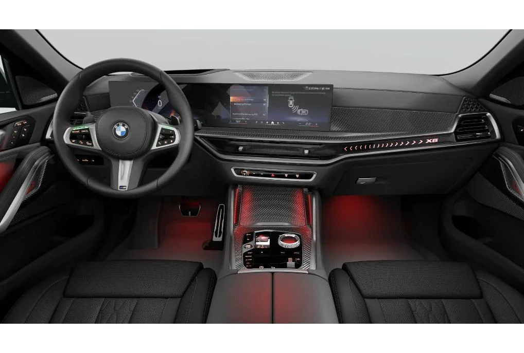 Kabina X6 to połączenie nowoczesnych technologii i dopracowanych detali. Skóra Merino, listwy M Carbon Fibre i panoramiczny dach tworzą luksusowy klimat, w którym każdy pasażer czuje się wyjątkowo. Fotele komfortowe z wentylacją, masażem i pamięcią ustawień gwarantują wysoki poziom wygody podczas każdej podróży. Czterostrefowa klimatyzacja, przyciemniane szyby i zaawansowane wyciszenie wnętrza podkreślają, że to samochód stworzony dla wymagających.