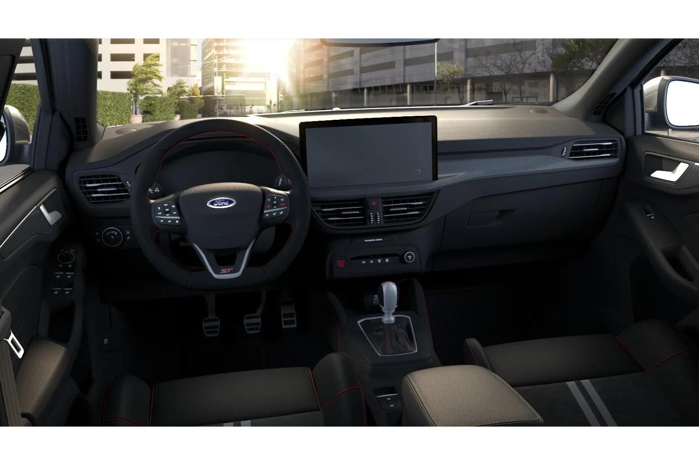 W kabinie Focusa ST X kierowca od razu czuje, że znalazł się w aucie zaprojektowanym z myślą o przyjemności prowadzenia. Sportowe fotele o głębokim podparciu trzymają pewnie w zakrętach, a ergonomiczny kokpit pozwala intuicyjnie obsługiwać najważniejsze funkcje. Materiały są przyjemne w dotyku, a ich jakość podkreśla półpremiumowy charakter wersji ST X, nie odbierając jej praktyczności.