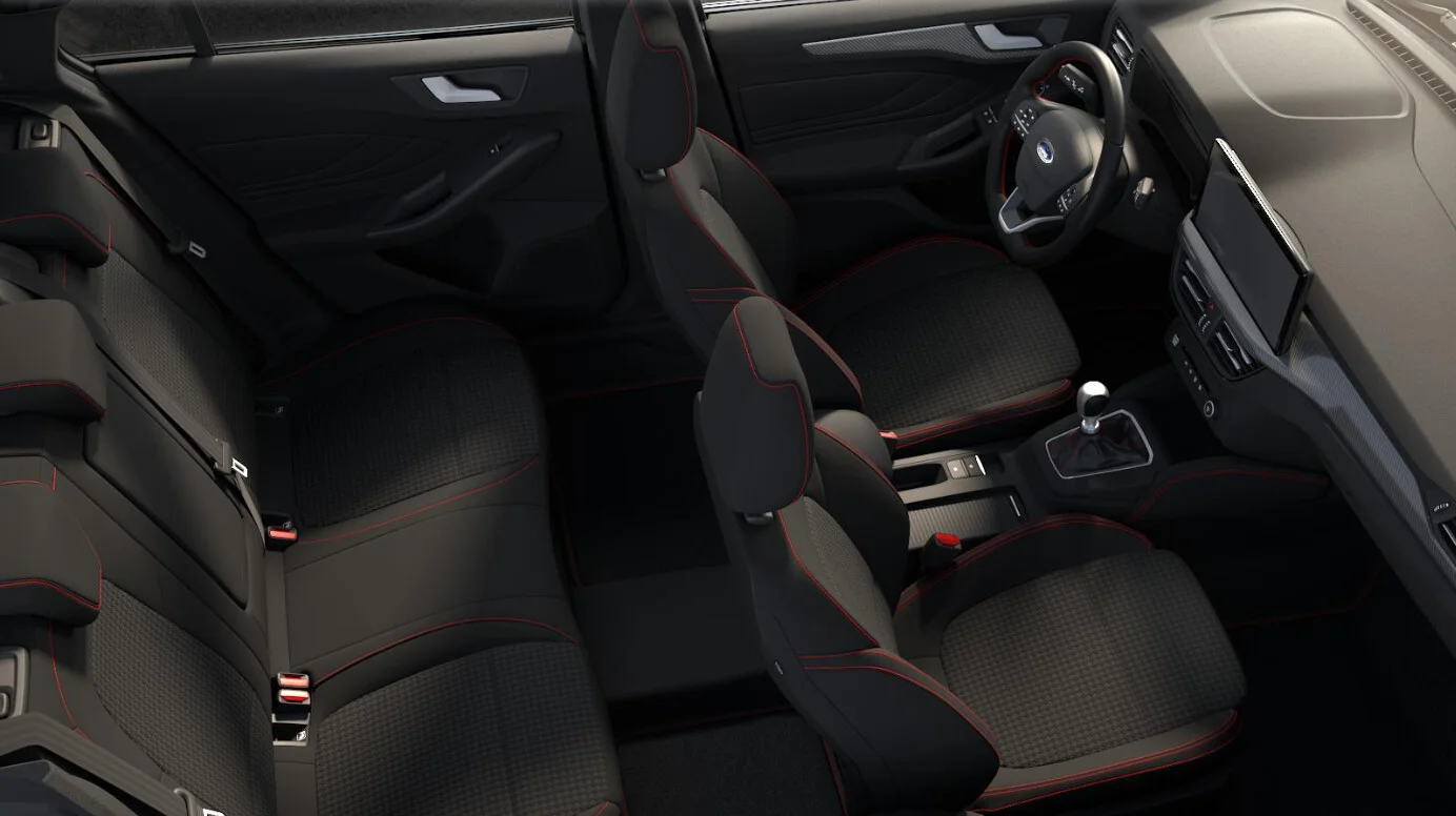 Wnętrze Focusa ST-Line X łączy sportowe akcenty z codzienną wygodą. Ciemna podsufitka, czerwone przeszycia i sportowa kierownica tworzą rasowy klimat, a wysoka jakość materiałów zapewnia przyjemne wrażenia podczas długich tras. Duży, 13,2-calowy ekran SYNC 4 z nawigacją oraz 12,3-calowy cyfrowy zestaw zegarów ułatwiają obsługę i dają nowoczesny charakter całej kabinie.