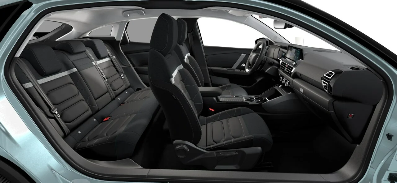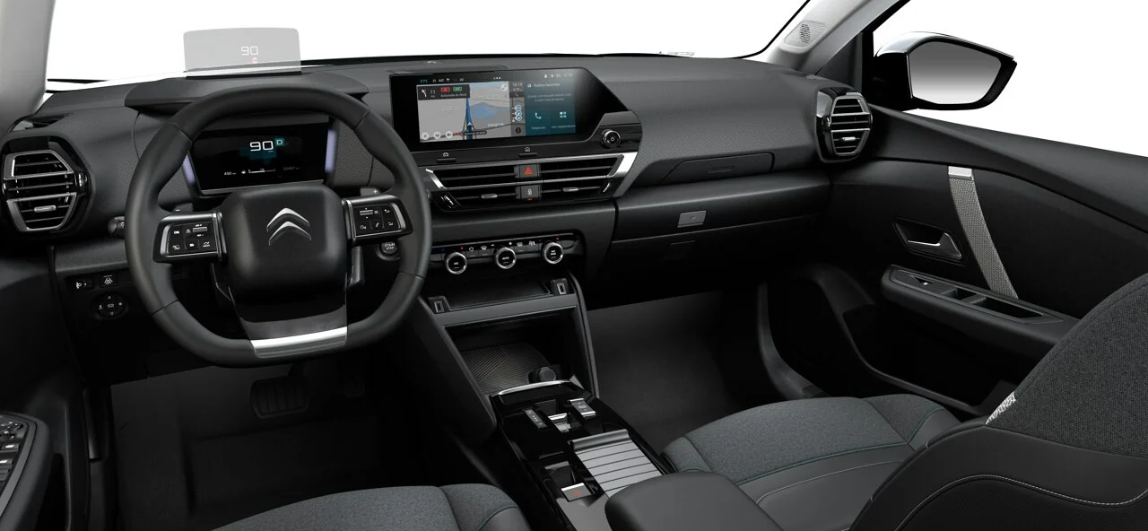 Wnętrze e-C4 zostało starannie zaprojektowane, aby zapewnić komfortową i przyjemną przestrzeń dla kierowcy i pasażerów. Nowoczesny kokpit oferuje intuicyjne rozwiązania i innowacyjne technologie, które ułatwiają korzystanie z samochodu. Duży wyświetlacz dotykowy umieszczony centralnie pozwala na łatwy dostęp do systemu multimedialnego, nawigacji i innych funkcji.