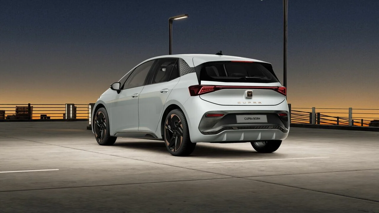 Pod względem wyglądu Cupra Born 58kWh prezentuje się nowocześnie i agresywnie. Charakteryzuje go aerodynamiczna sylwetka z przyciemnianymi tylnymi szybami i opływowym kształtem, który minimalizuje opór powietrza. Na przednim pasie dominuje imponująca, duża atrapa chłodnicy oraz smukłe, ostro zarysowane reflektory LED, które dodają mu charakterystycznego wyrazu.