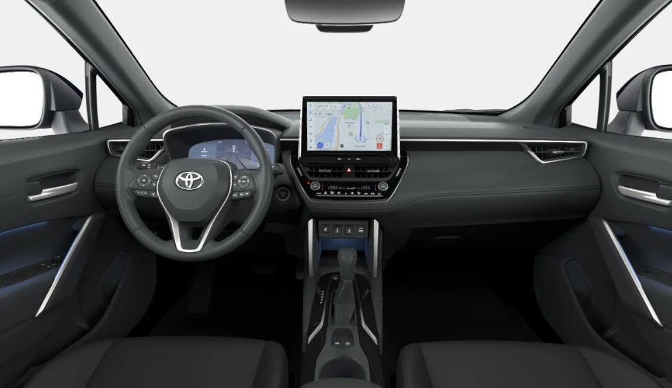 Opis wnętrza: Wnętrze Toyota Corolla Cross Hybrid jest przestronne i nowoczesne. Znajduje się w nim komfortowe siedzenia dla pięciu pasażerów, z wystarczającą ilością miejsca zarówno dla kierowcy, jak i pasażerów. Materiały użyte do wykończenia są wysokiej jakości, a ergonomia wnętrza została starannie zaprojektowana. Centralnym elementem deski rozdzielczej jest duży ekran dotykowy, na którym można kontrolować różne funkcje samochodu, w tym system multimedialny, nawigację, i inne.