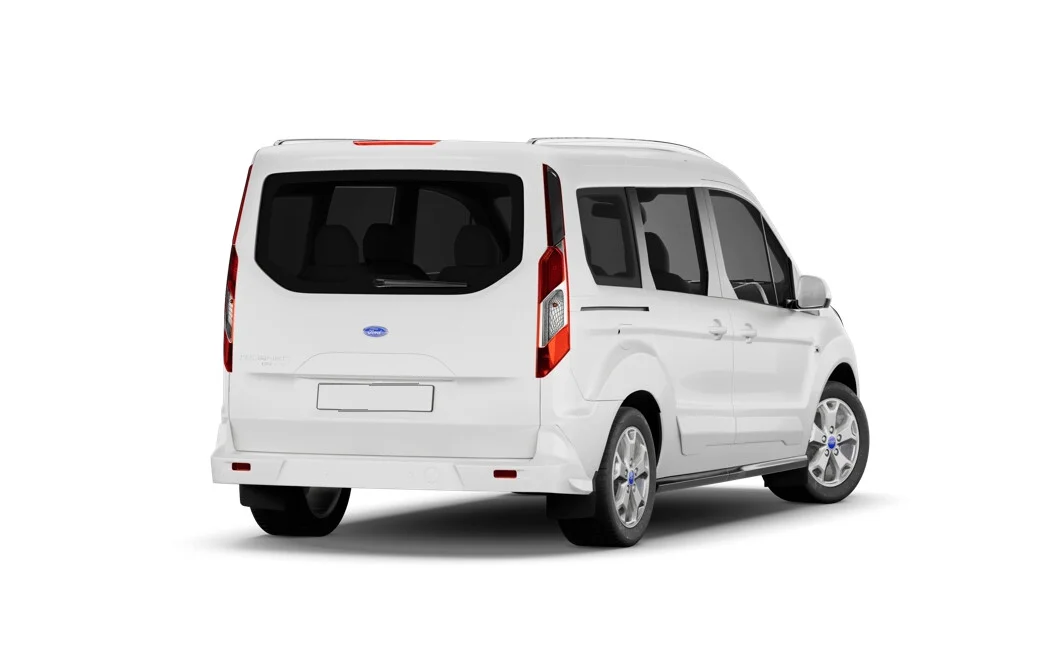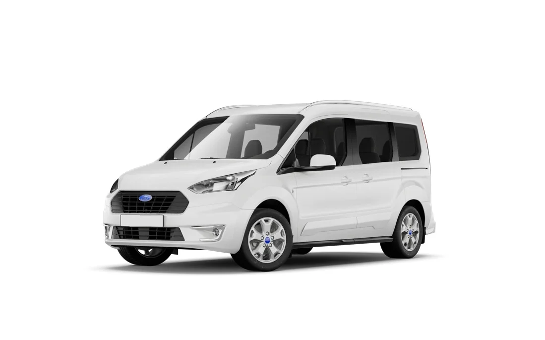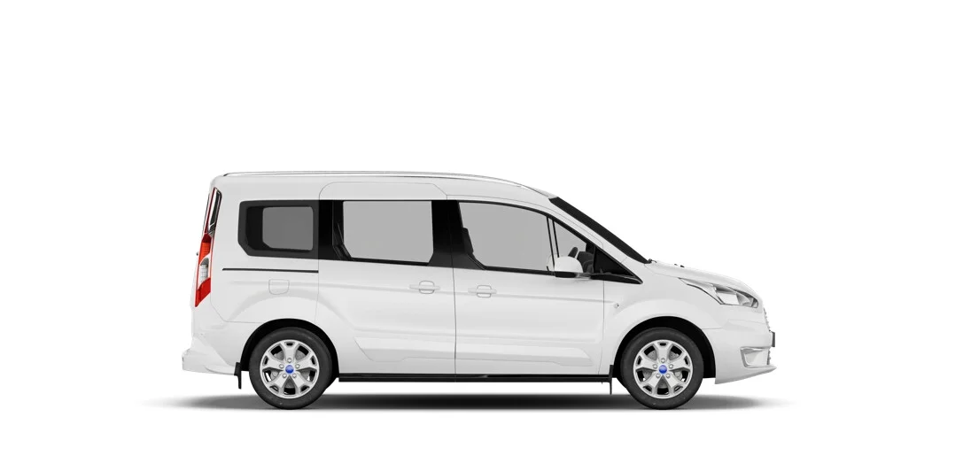 Tourneo Connect Titanium wyróżnia się nowoczesnymi technologiami, w tym TPMS, Pre-Collision Assist, tempomatem z ogranicznikiem prędkości oraz EBA. Z zewnątrz pojazd prezentuje się elegancko z lakierem Frozen White, 16-calowymi aluminiowymi obręczami kół oraz ciemnymi szybami w tylnej części nadwozia.