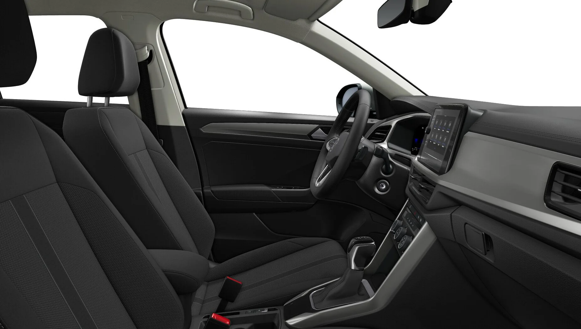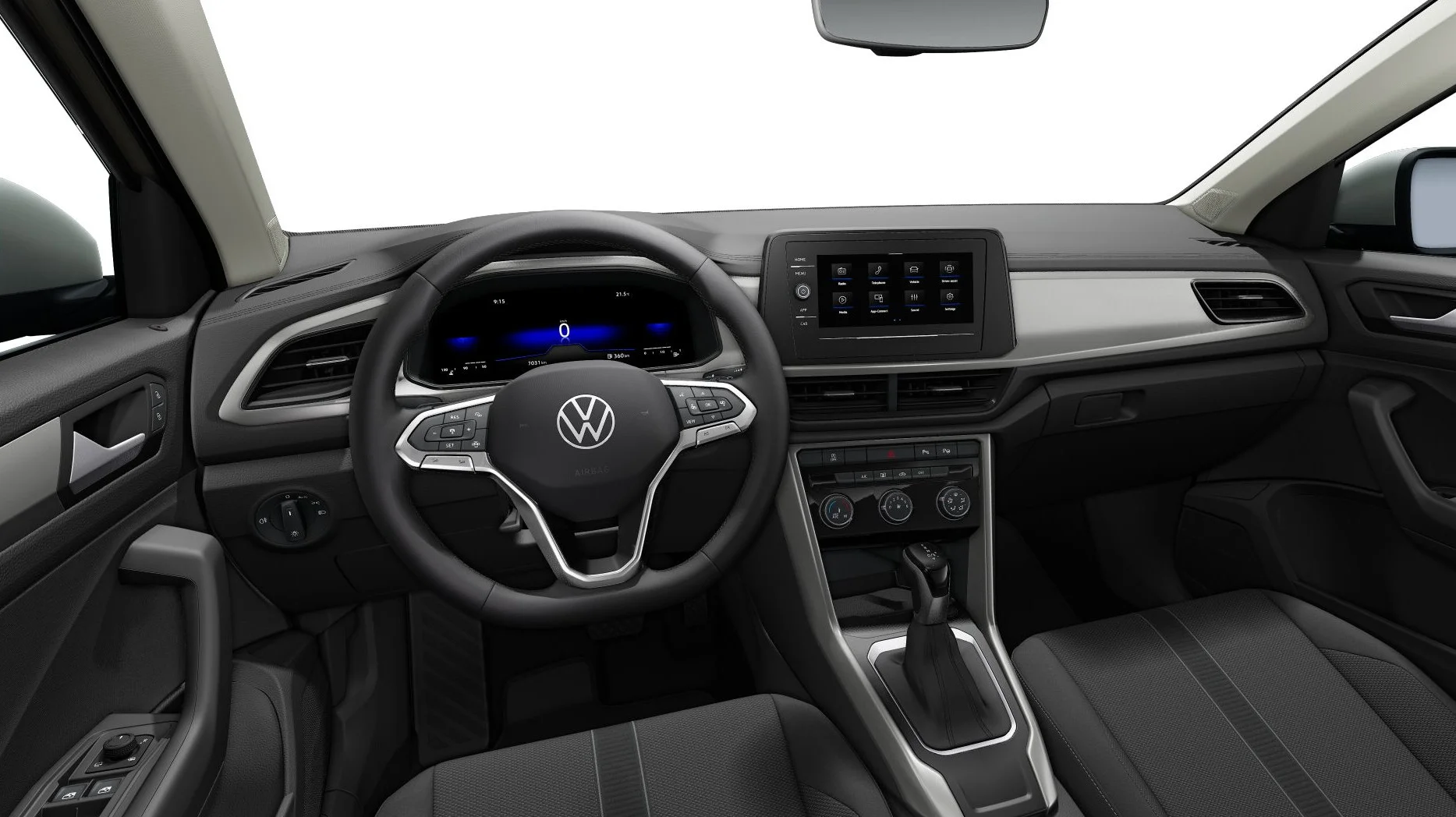 Jakie udogodnienia znajdują się we wnętrzu Volkswagen T-Roc Life? Wnętrze oferuje tapicerkę "Tracks 4", cyfrowy zestaw wskaźników Digital Cockpit, radio Composition, system App-Connect i podłokietnik ze schowkiem.