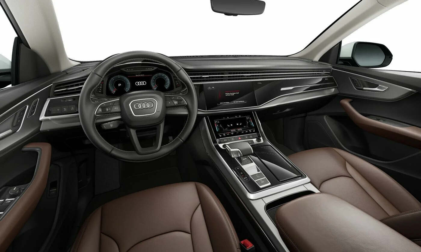 Wnętrze Q8 45 TDI zachwyca luksusem i nowoczesnością. Wysokiej jakości materiały, takie jak skóra i aluminiowe wykończenia, tworzą eleganckie i komfortowe środowisko. Intuicyjny system multimedialny z dużymi ekranami dotykowymi, cyfrowym zestawem wskaźników i zaawansowanymi funkcjami łączności sprawia, że obsługa pojazdu jest intuicyjna i przyjemna.