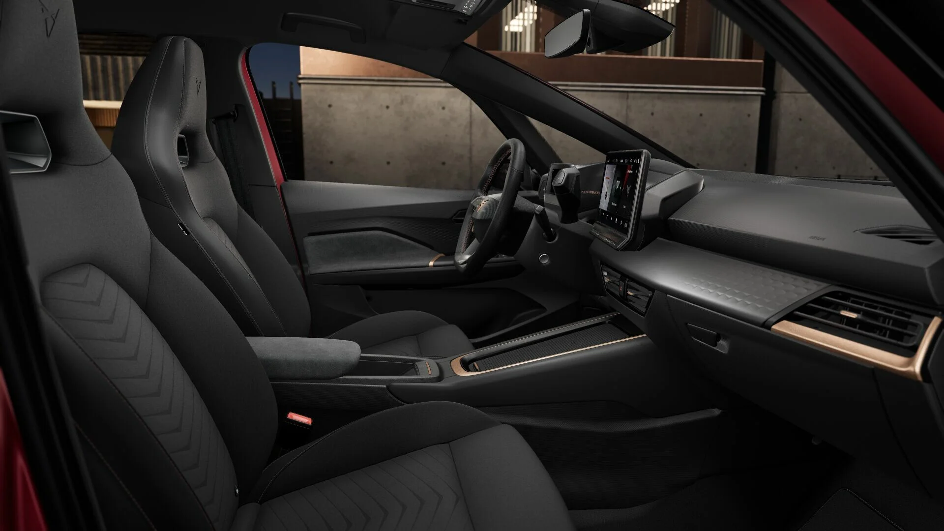 Wnętrze CUPRA z elementami dekoracyjnymi deski rozdzielczej w kolorze miedzi, czarna podsufitka oraz dywaniki welurowe z przodu i z tyłu