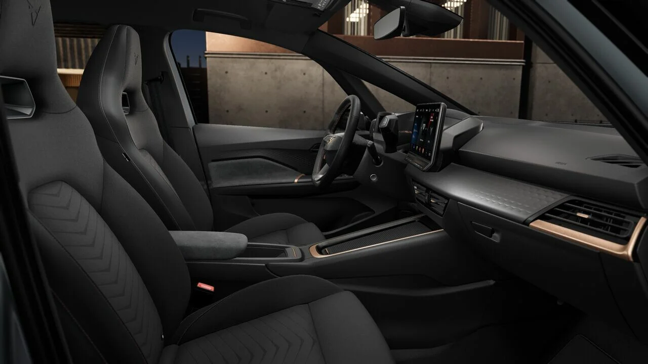 Wnętrze CUPRA z elementami dekoracyjnymi deski rozdzielczej w kolorze miedzi, czarna podsufitka oraz dywaniki welurowe z przodu i z tyłu