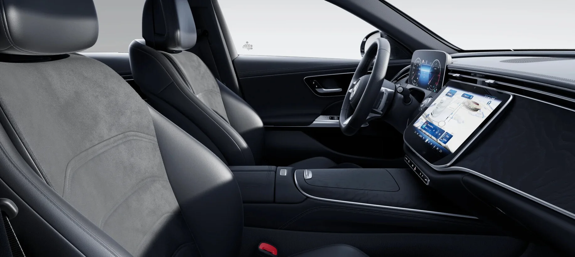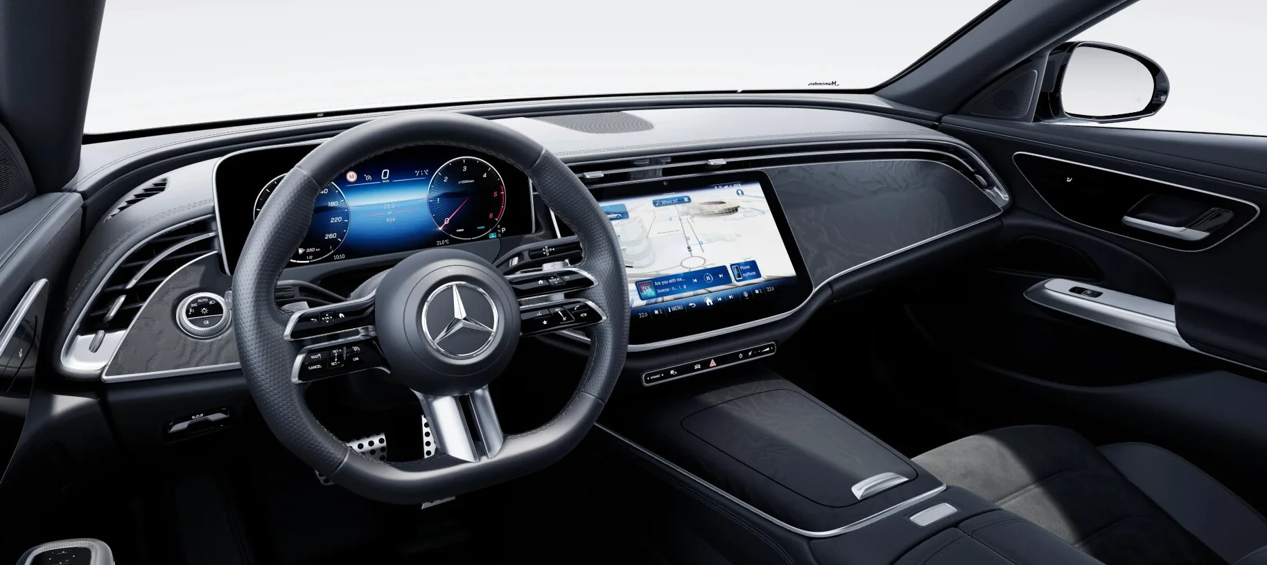 Wnętrze: W kabinie dominuje luksus i sportowa elegancja, charakterystyczne dla pakietu AMG. Wysokiej jakości materiały, takie jak skóra ARTICO/DINAMICA i dekoracyjne elementy z aluminium, tworzą atmosferę ekskluzywności. Sportowe fotele AMG z doskonałym wsparciem bocznym, wielofunkcyjna kierownica pokryta skórą nappa oraz pedały ze stali nierdzewnej z gumowymi wypustkami zwiększają sportowy charakter wnętrza, jednocześnie zachowując wysoki komfort podróży.