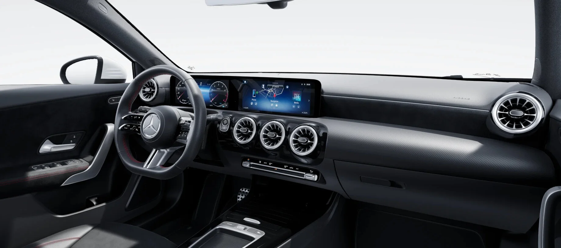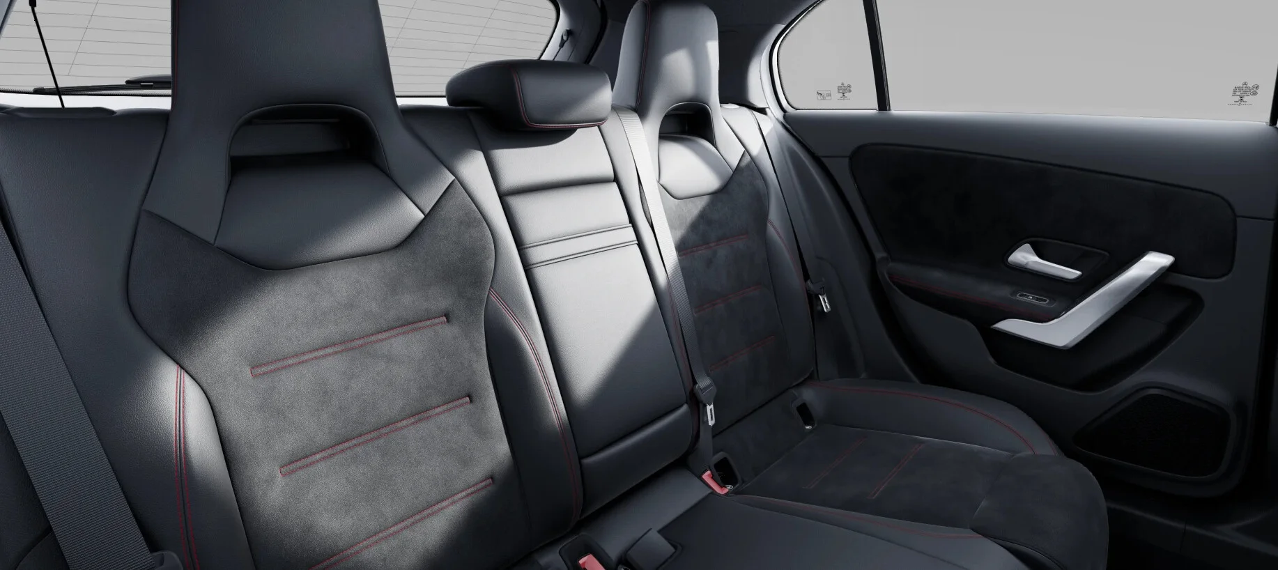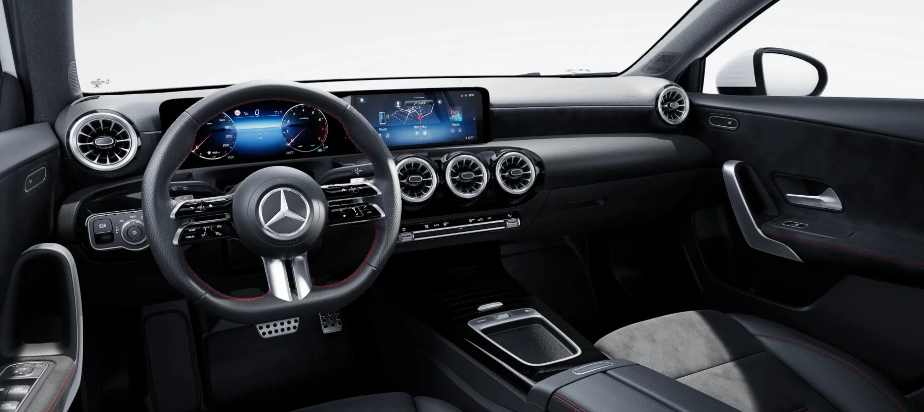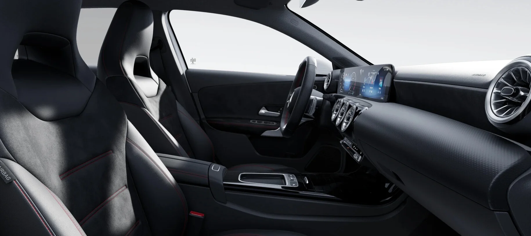 Wnętrze: Kabina A 200 AMG-Line to połączenie sportowej elegancji z luksusowym komfortem. Sportowe fotele z wyraźnym wsparciem bocznym, pokryte wysokiej jakości materiałami, w tym skórą ARTICO/DINAMICA, oferują optymalne wsparcie i wygodę. Multifunkcyjna kierownica pokryta skórą Nappa, pedały ze stali nierdzewnej oraz dekoracje wnętrza z karbonu dodają wnętrzu sportowego charakteru, a jednocześnie zachowują jego eleganckie wykończenie.