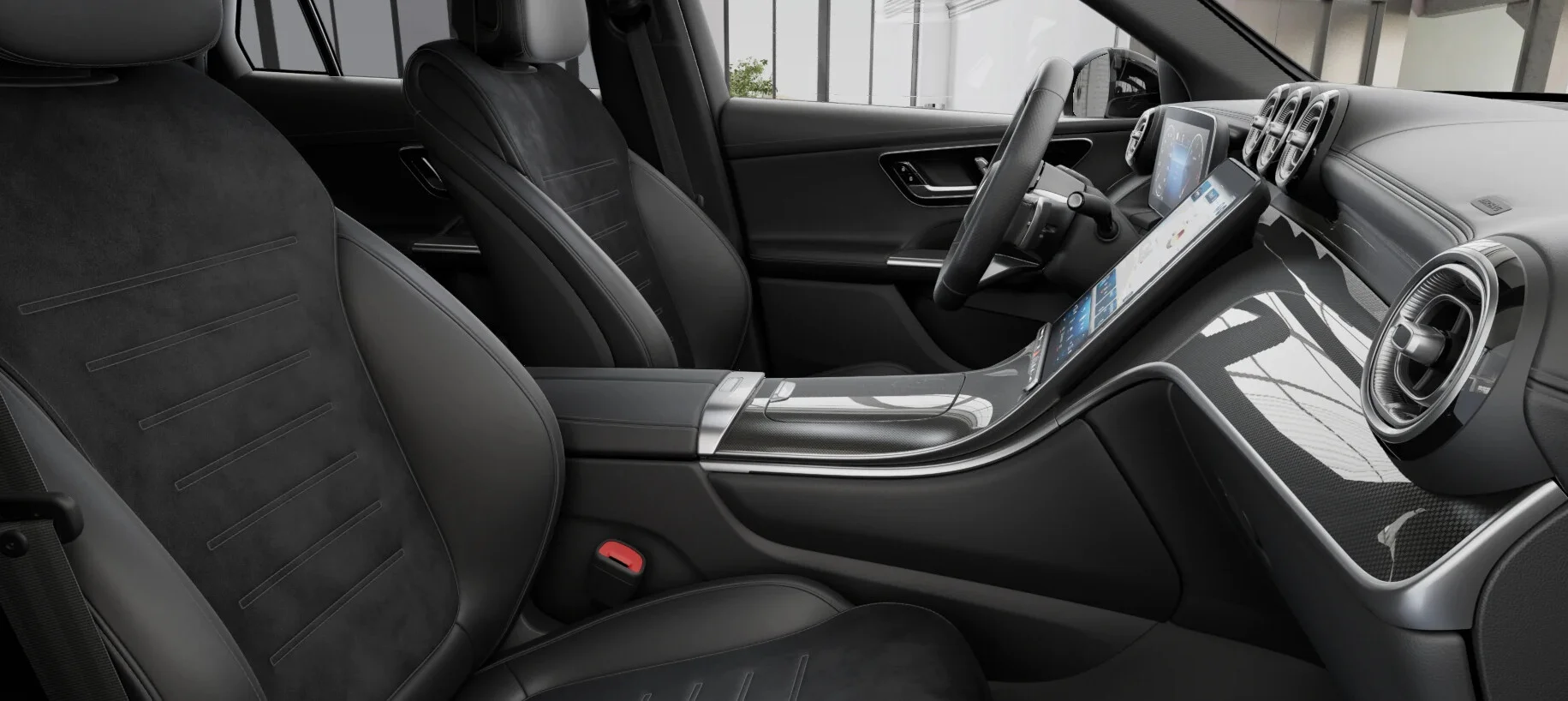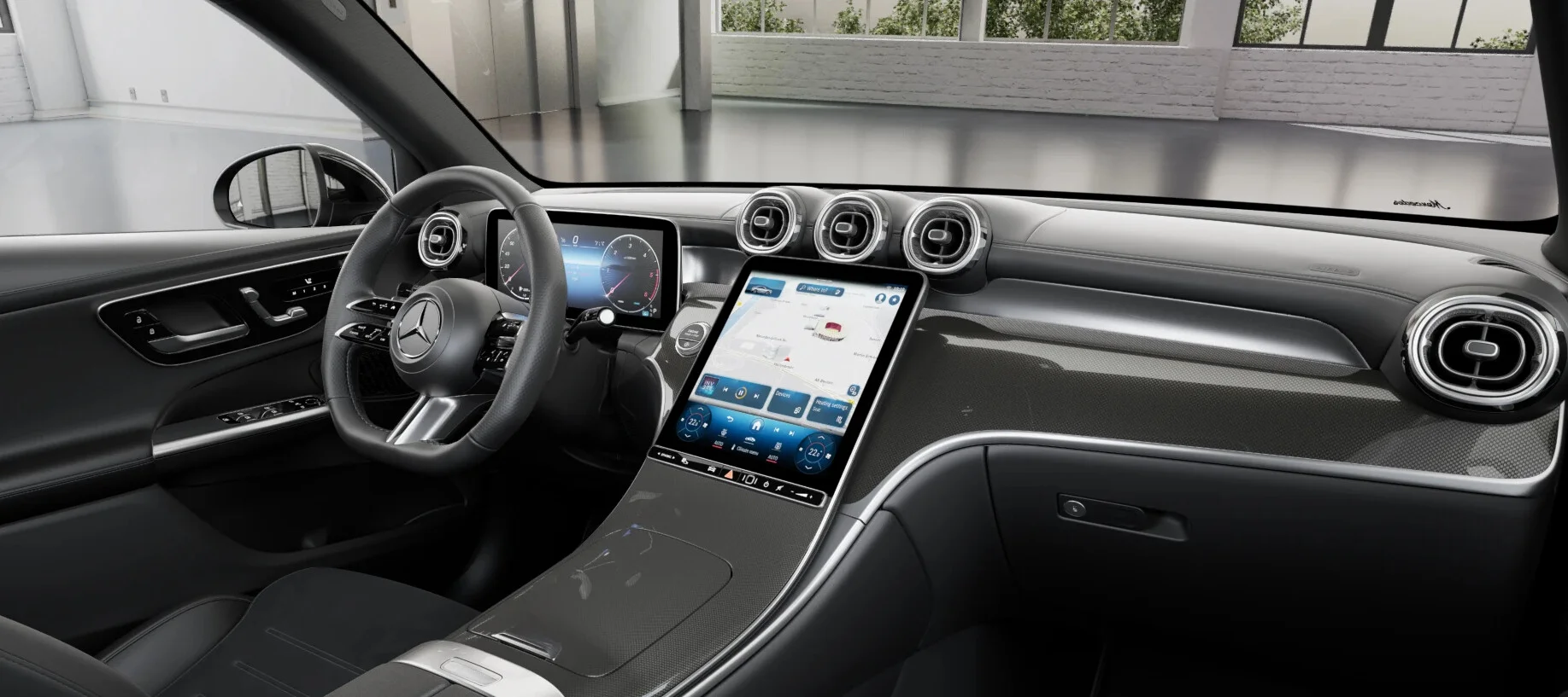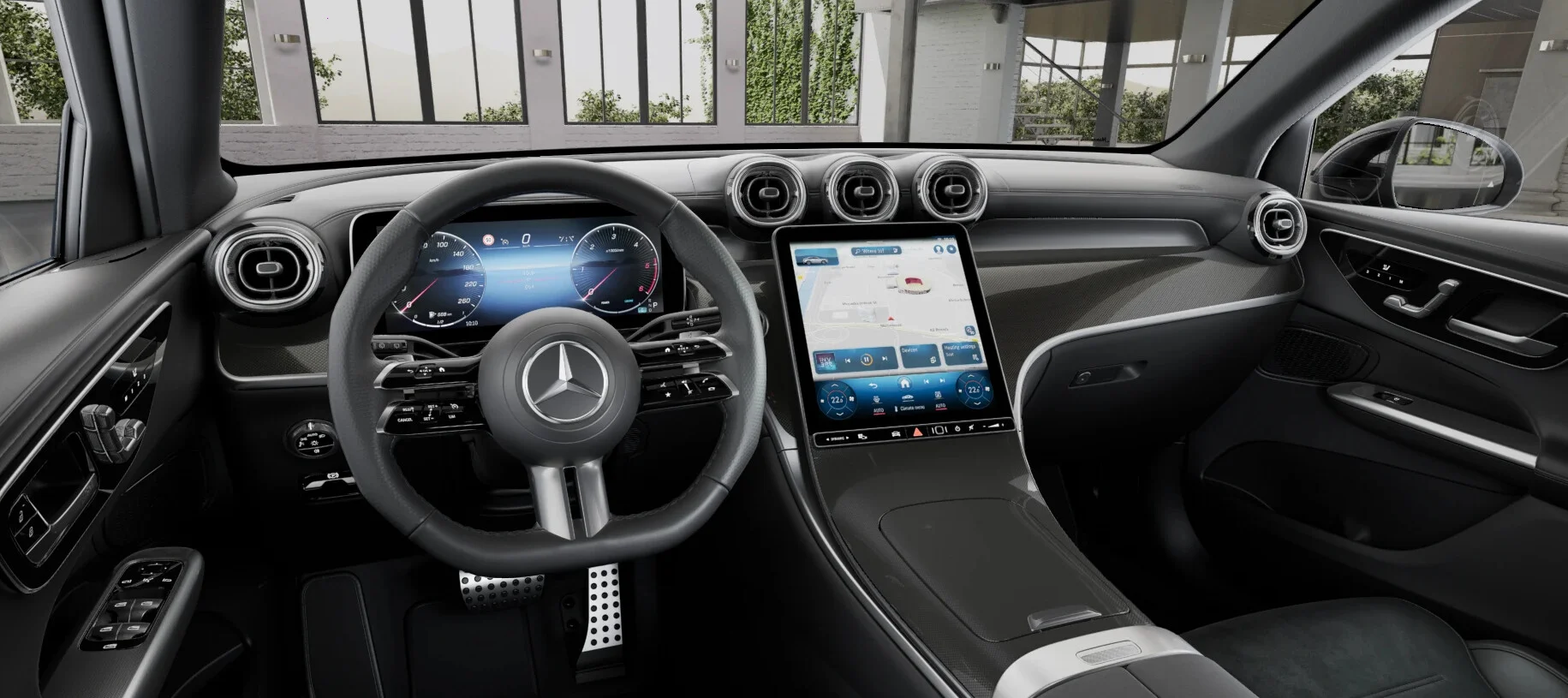 Wnętrze Mercedesa GLC 220d 4MATIC AMG Premium to kwintesencja luksusu i sportowego charakteru. Kabina została wykonana z najwyższej jakości materiałów, w tym z skóry nappa, aluminium oraz elementów wykończeniowych AMG. Fotele sportowe z regulacją elektryczną, pamięcią ustawień oraz funkcją podgrzewania zapewniają najwyższy komfort, a wielofunkcyjna kierownica AMG wykończona skórą Nappa z manetkami do zmiany biegów podkreśla sportowy charakter pojazdu.