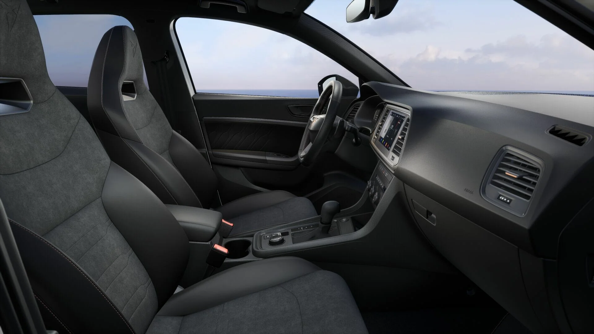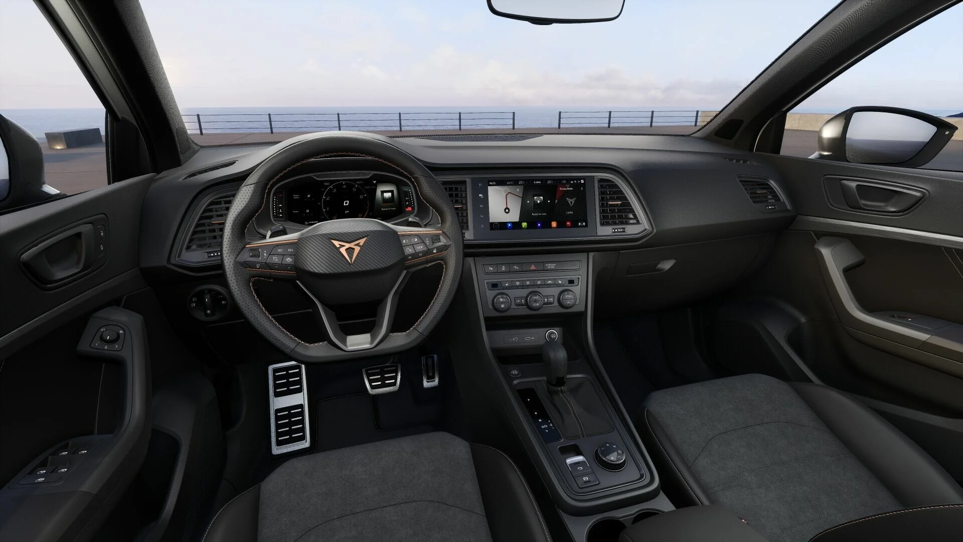 Wnętrze Cupra Ateca VZ zostało zaprojektowane z myślą o najwyższym komforcie i funkcjonalności. Przestronna kabina oferuje najwyższej jakości materiały, sportowe fotele wykończone skórą i Alcantarą oraz przemyślane rozwiązania, które zapewniają wygodę zarówno kierowcy, jak i pasażerom. Nowoczesny system multimedialny z dużym ekranem dotykowym, nawigacją oraz integracją smartfona poprzez Apple CarPlay i Android Auto zapewnia łatwy dostęp do wszystkich funkcji pojazdu. Cyfrowy kokpit Cupra oferuje intuicyjny dostęp do informacji o pojeździe, zwiększając komfort i bezpieczeństwo jazdy.